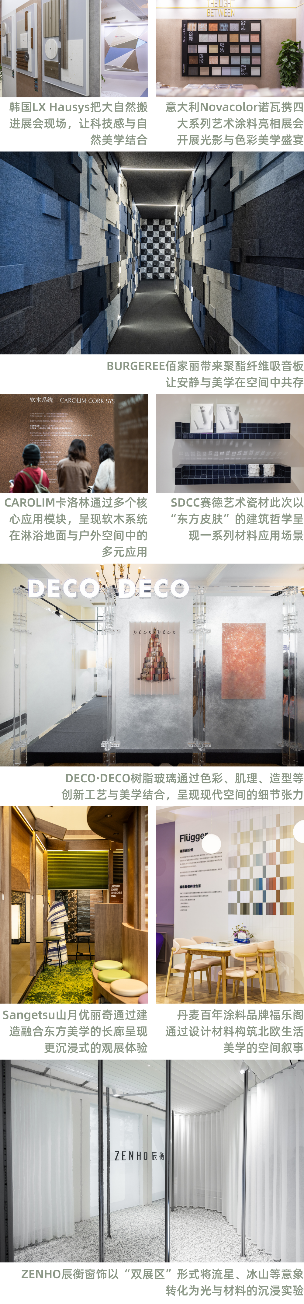 在新材料与应用展区,“可持续”、“自然共生”这些议题不再只是口号,而是让材料从辅助元素升级为空间叙事主角,深挖材质质感与技术属性,探索生态与设计的共生路径。Armstrong Flooring阿姆斯壮、韩国LX Hausys、意大利Novacolor诺瓦、DECO·DECO树脂玻璃等国内外品牌尽显“材料觉醒”的趋势,可持续设计从“减少伤害”的被动逻辑,走向“主动赋能”的积极路径,呼应科勒·设计上海全球设计大会的主题。在这里,材料不再是辅助,而成为驱动空间叙事与体验的核心媒介。