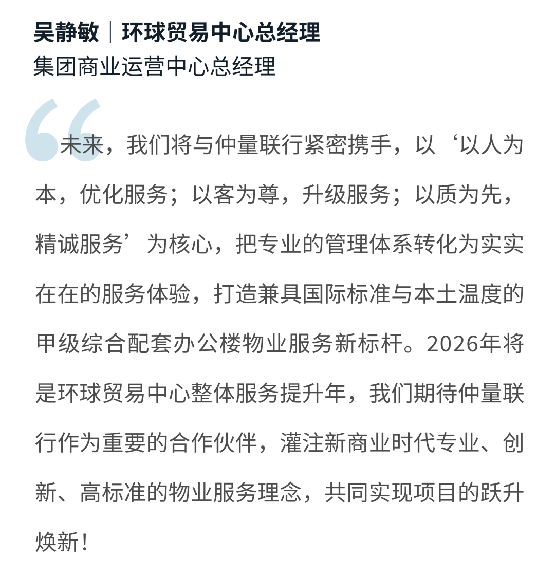 从2014年的初次携手到2026年的战略重聚,仲量联行与环球贸易中心共同走过了一段信任与合作的历程。未来,双方将以更加紧密的协作,共同推动项目服务品质提升。