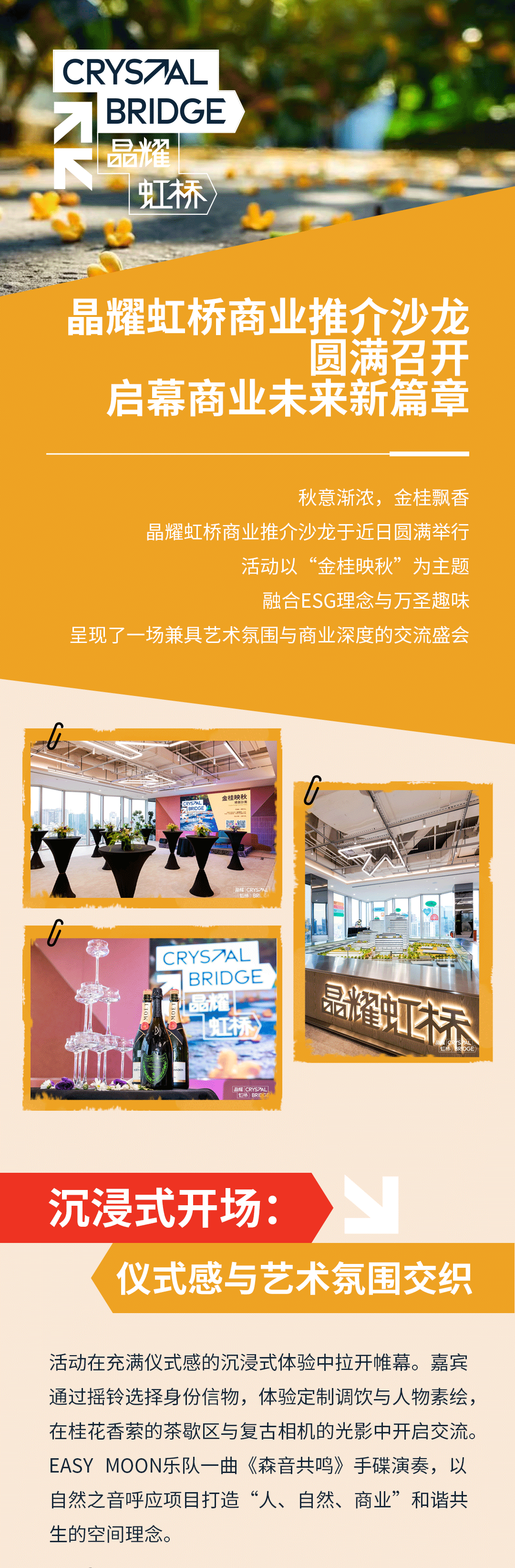 日,铁狮门旗下商业项目晶耀虹桥成功举办以“金桂映秋”为主题的商业推介沙龙。作为项目的首席招商代理,第一太平戴维斯(Savills)与主办方共同邀约多位行业嘉宾齐聚现场,在艺术氛围与商业洞察交织的沉浸体验中,共话晶耀虹桥作为长宁区新兴商业地标的未来价值,这也标志着项目招商进程迈入全新阶段。
