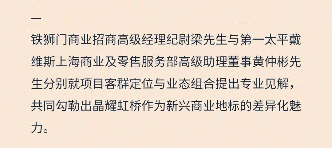 我们非常看好晶耀虹桥在长宁片区所带来的商业活力。项目以精准的客群定位和富有创意的业态组合,不仅在空间设计上联结人与自然,更在消费场景中融入艺术与可持续理念,未来将有望成为区域商业焕新的重要引擎。第一太平戴维斯也将依托对零售市场的深刻洞察与全程招商服务能力,为项目引入优质品牌资源,携手打造更具温度与创意的商业新标杆。”