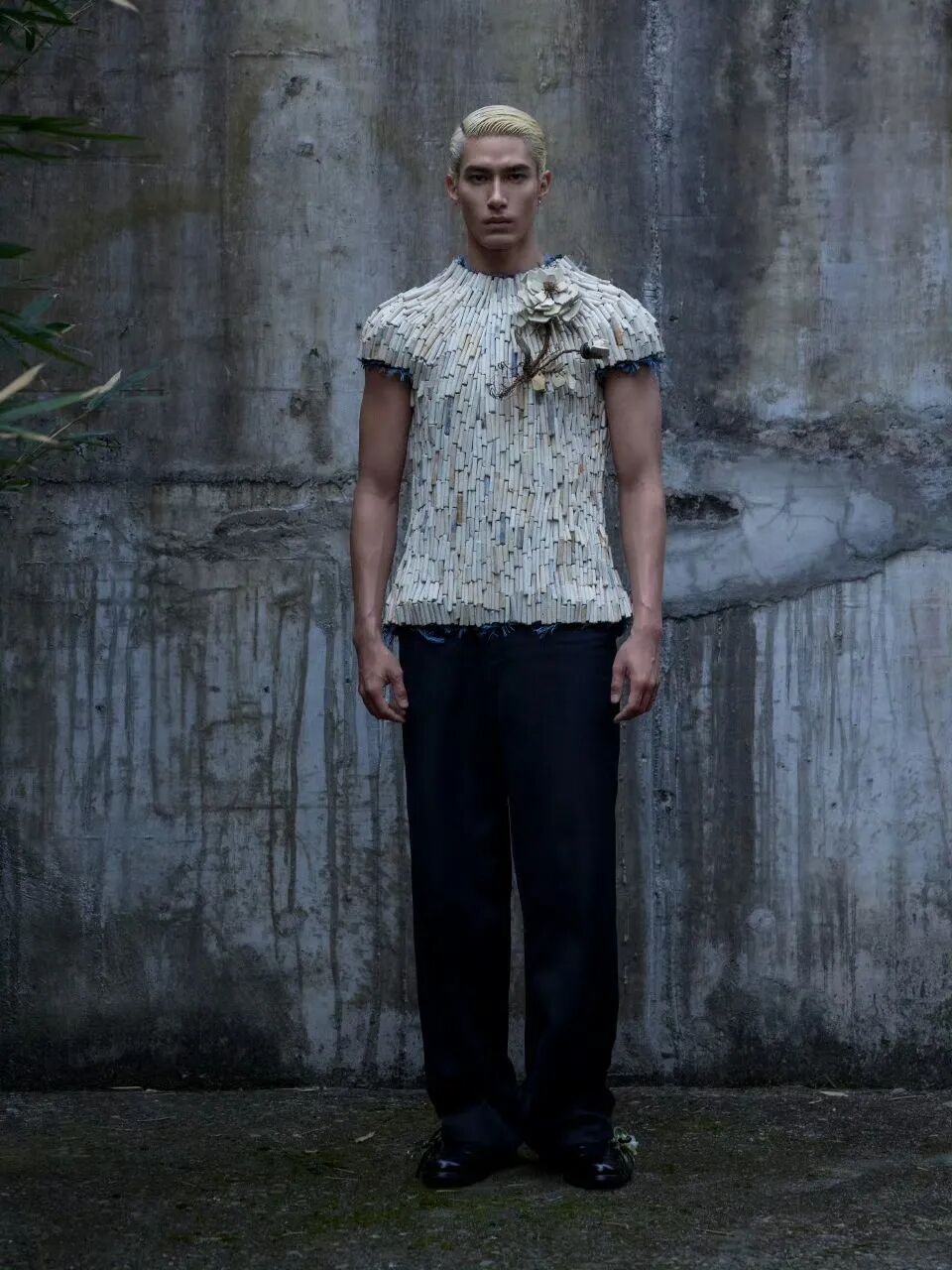 宋威龙身穿 JUNYANG 26SS 男装秀款的圆领外套,搭配立领白色衬衫,清秀自然。把传统元素融入基础单品的方式,也让新中式更加符合现代穿搭语境,适配多种场合需求。