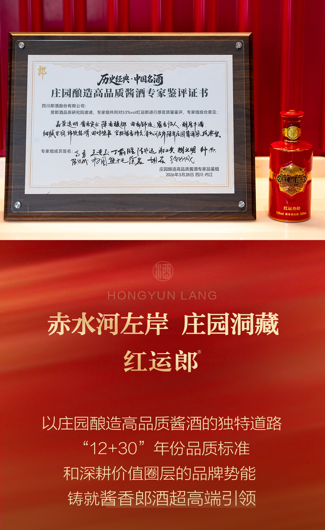 3月28日,由中国食品工业协会主办的“中国高品质酱酒共鉴会”在四川内江举行,在这场汇聚众多名酒评委和行业泰斗、专家的鉴评会中,红运郎以其“赤水河左岸陈年庄园酱酒风格典型”,赢得现场评委、专家的一致好评。