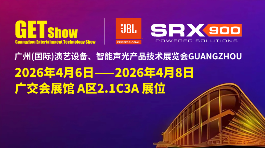 2026年4月6日-8日, JBL Pro SRX900 系列新品亮相 2026 GETshow,展位 A 区 2.1 馆 C3A,现场亲测,感受小体积迸发出的巨大能量。
