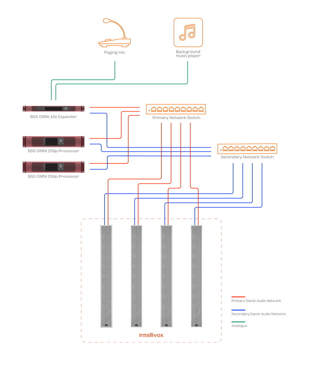 而 Intellivox 基于 Dante 的主备网络架构,构建了一条从信号源到终端的完整数据通道: