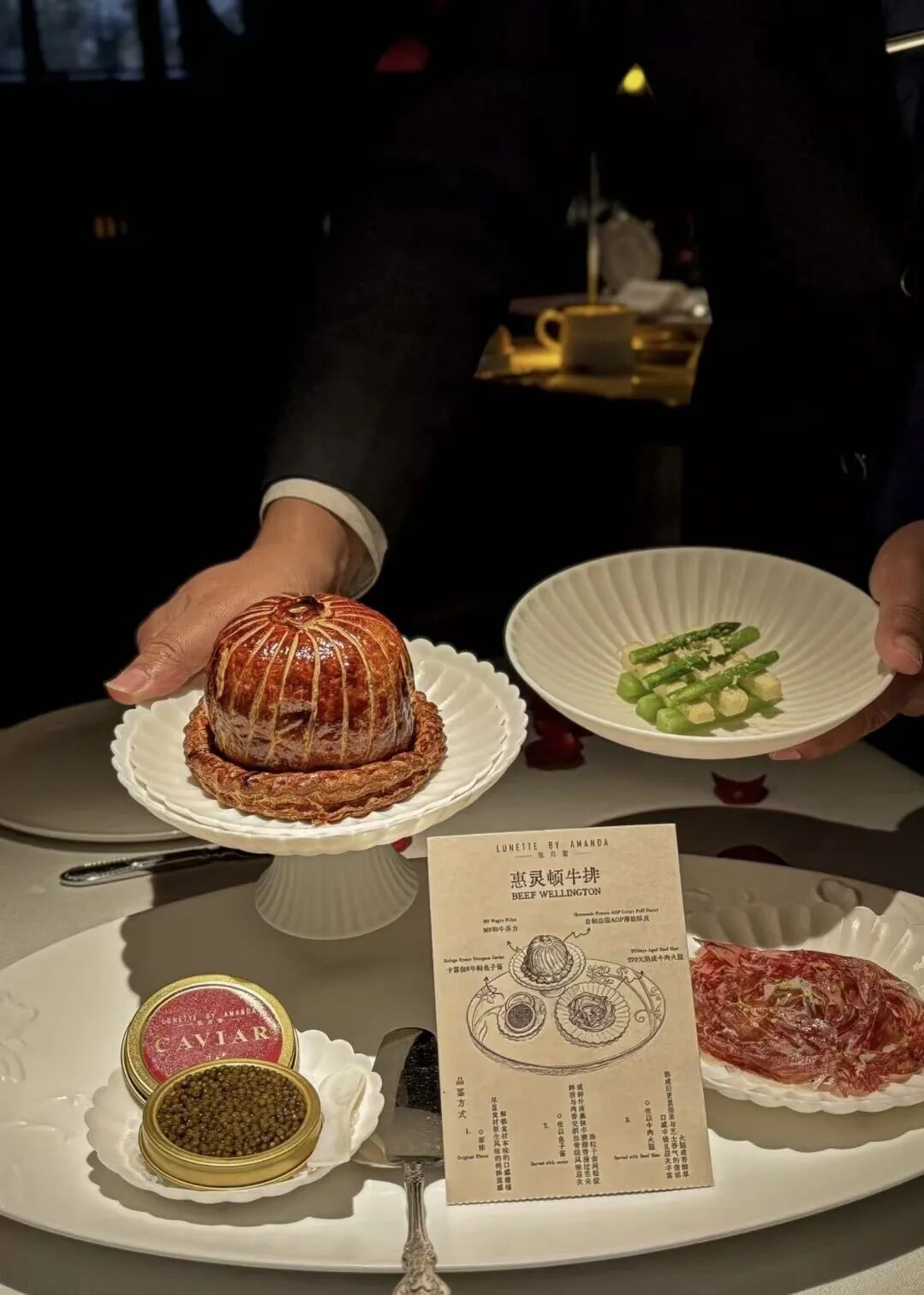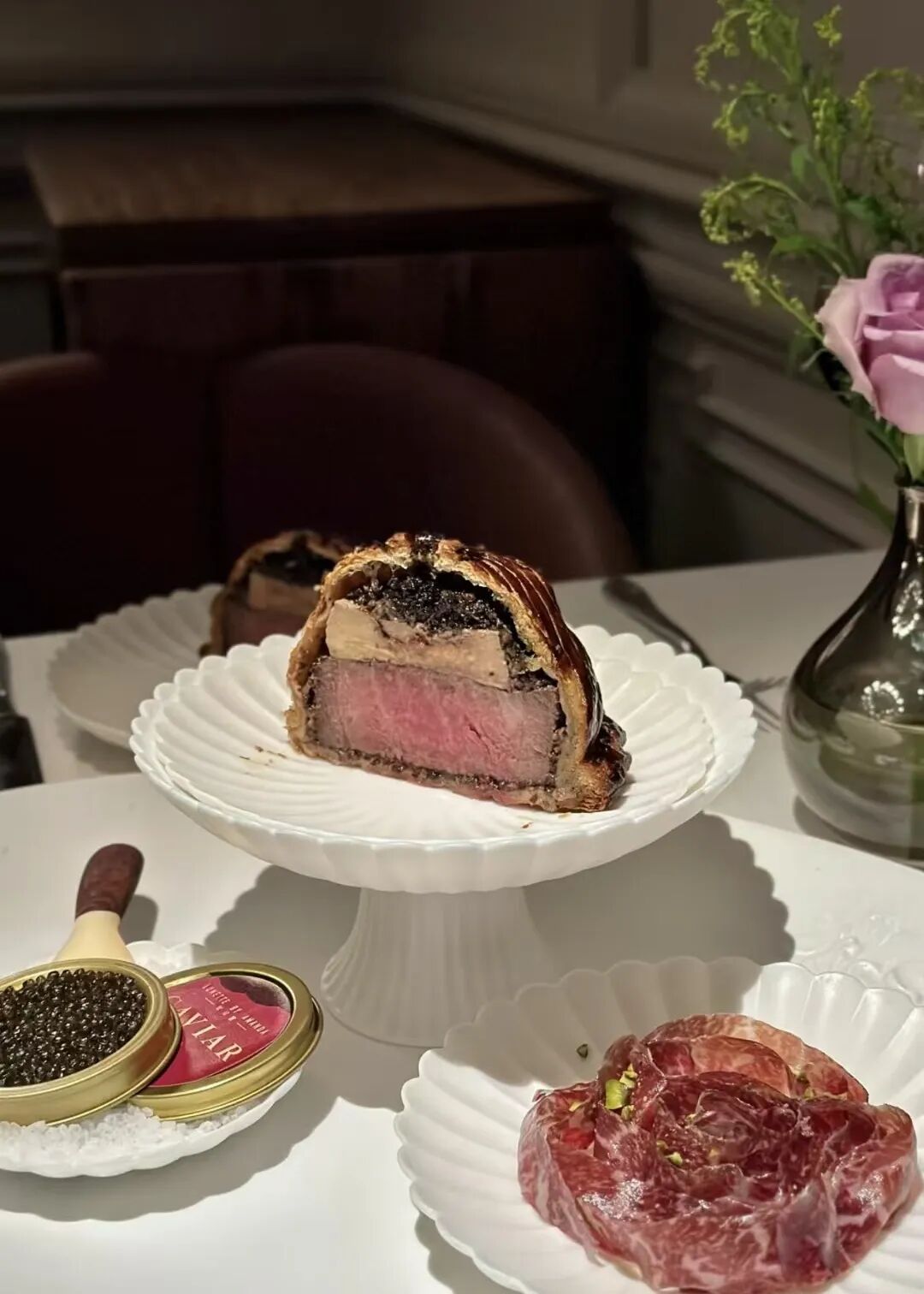 惠灵顿牛排,是弦月窗的招牌菜品,凭借三重奏的仪式感吃法与顶级食材组合,更是成为上海法餐界的代表作。