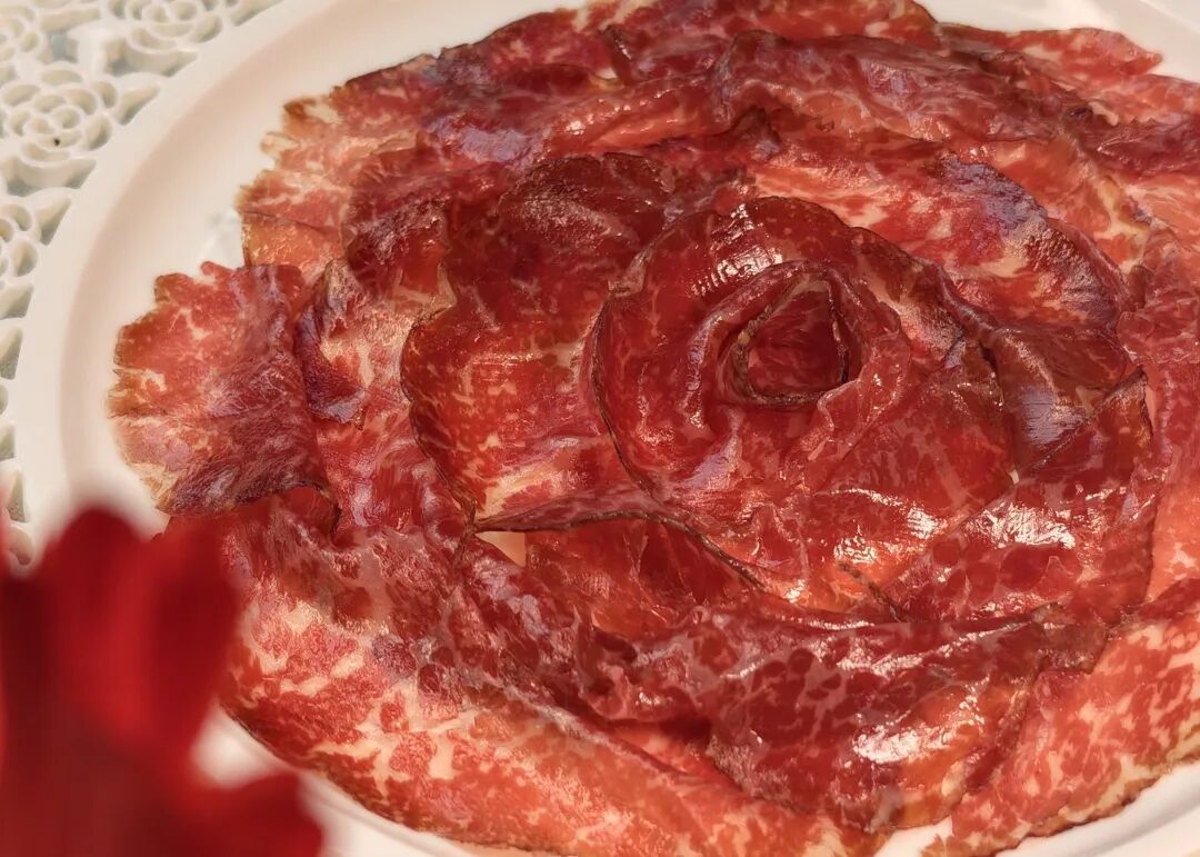 270天熟成M9+和牛肉火腿,油脂均衡,浓郁的芝士与坚果香气缠绕舌尖,服务员于桌边现场手工刨制,薄如蝉翼的肉片在精致镂花的瓷盘中层层叠放,宛若一朵正在盛放的玫瑰。