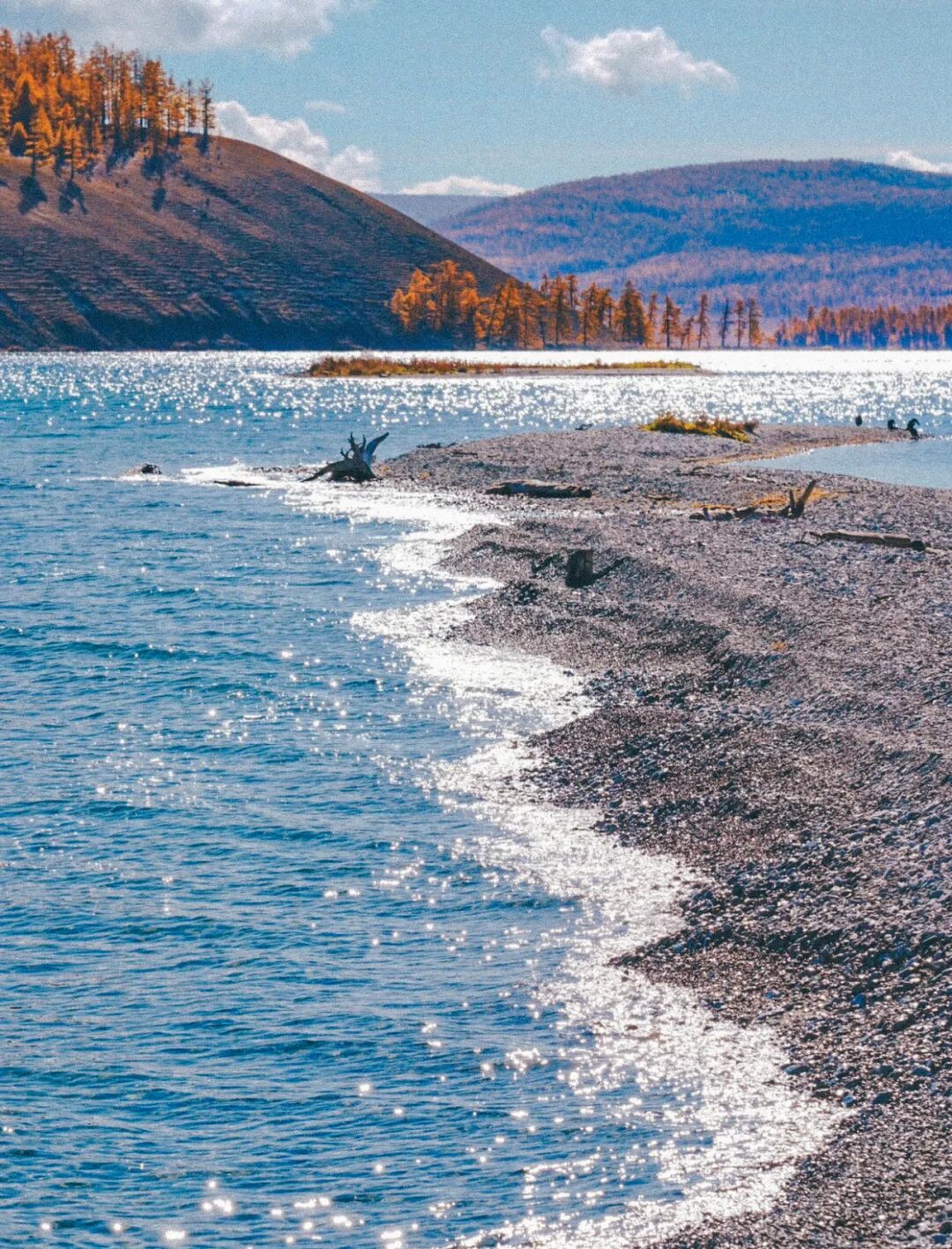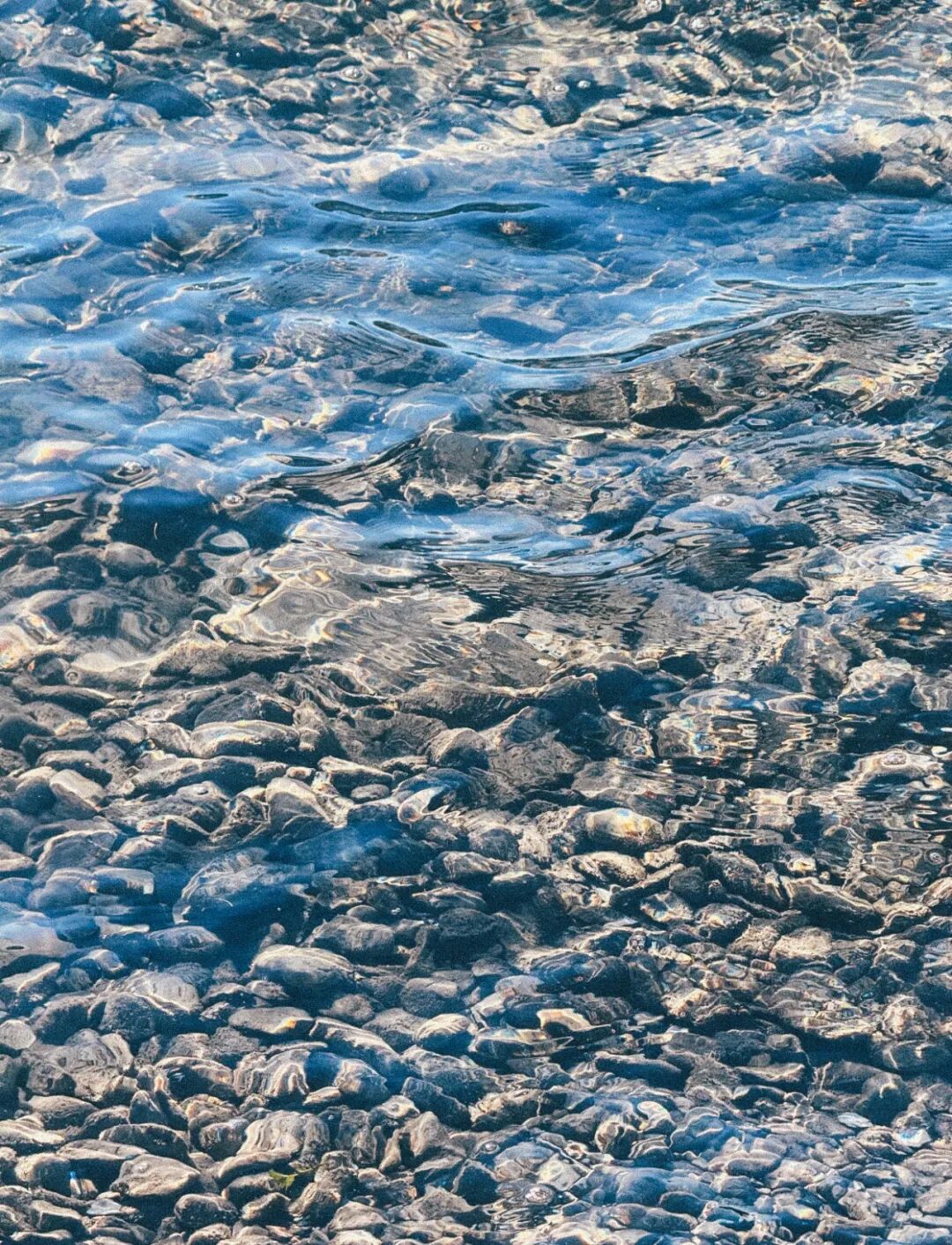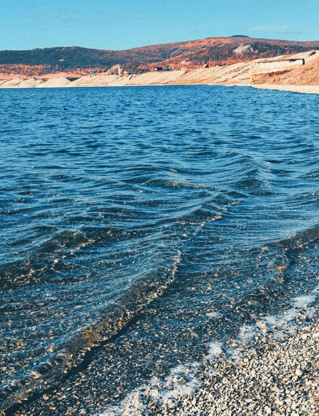 水是透明的。近岸处能看到水底的卵石,一颗一颗,圆润光滑,像是被湖水含在嘴里磨了很久。阳光穿透水面,在沙地上投下光斑,随着波纹晃动,像碎掉的镜子。