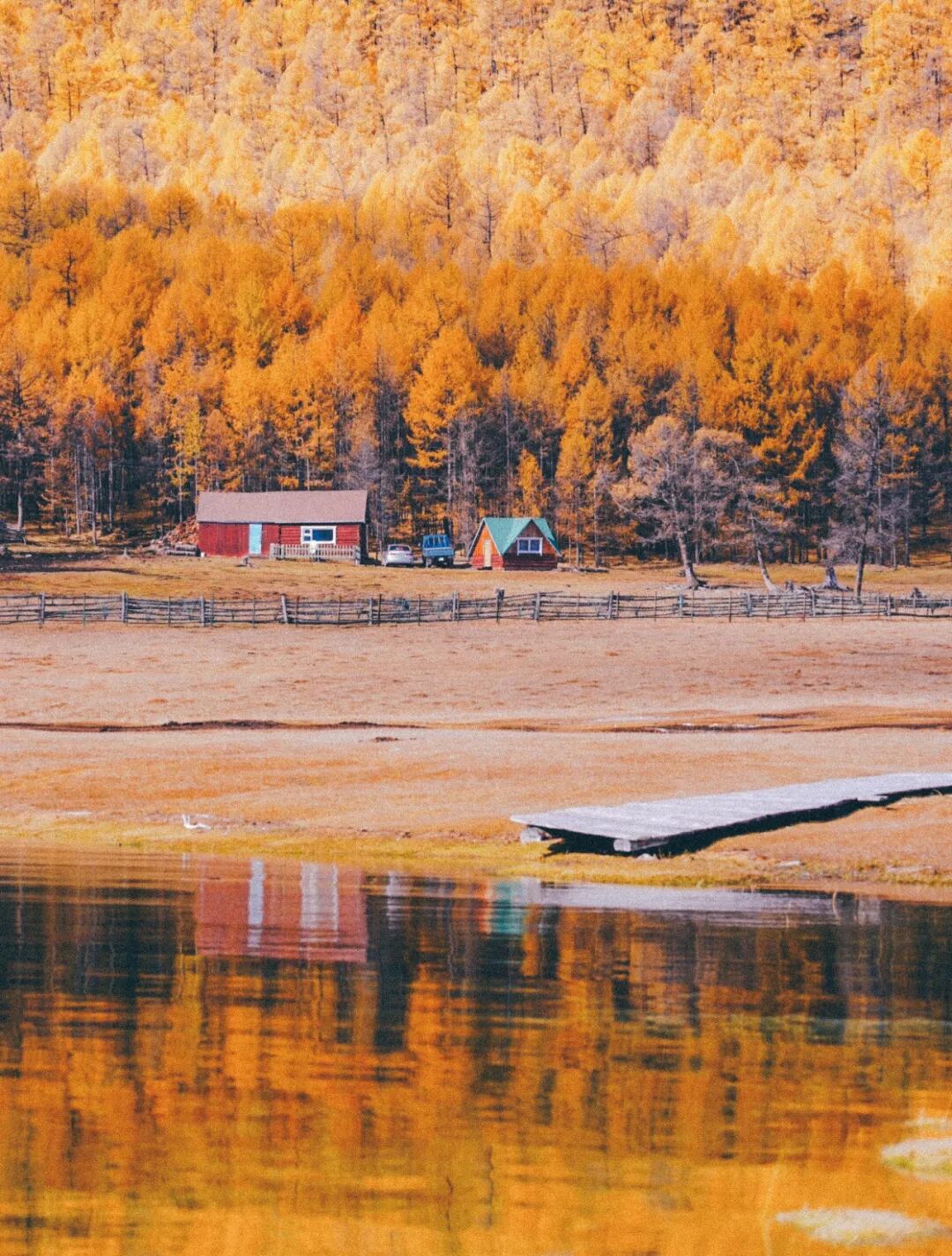 远处,山峦开始出现。不是那种陡峭嶙峋的山,而是圆润的、温和的,像大地隆起的脊背。如果是秋日,山上的落叶松林正处在最好的季节,金灿灿的,从山脚一路烧到山顶。风吹过的时候,整片森林都在动,像一片凝固的、金色的海浪。