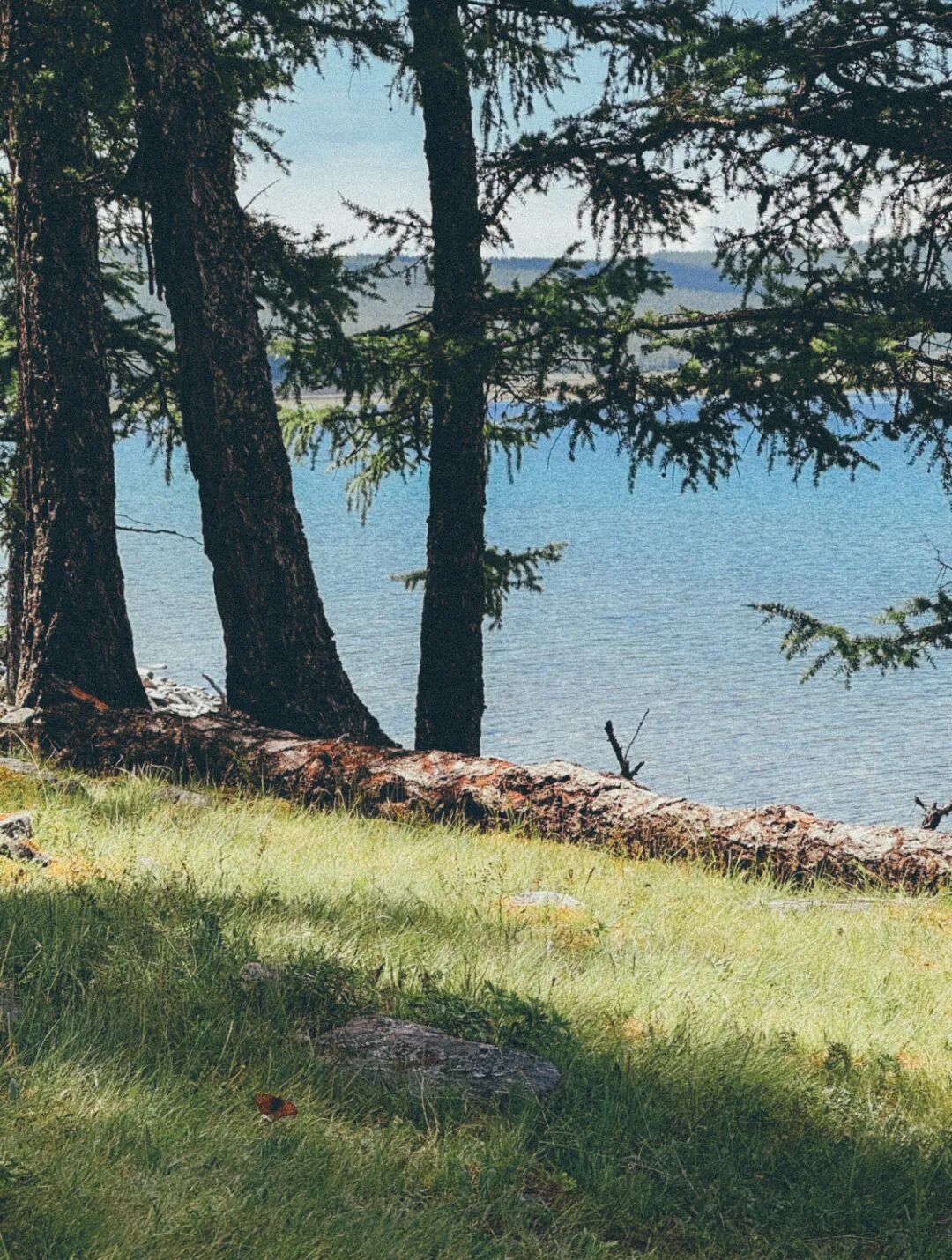 湖的四周是泰加林,西伯利亚松和落叶松密密匝匝地挤在一起,树干笔直,指向天空。林子里很暗,也很安静,只有脚下松针发出的窸窣声。偶尔有风穿过,树冠发出沙沙的响声,像有人在很远的地方说话。阳光从枝叶的缝隙里漏下来,落在地上,变成一个个光斑,随着风晃动,像是活的。