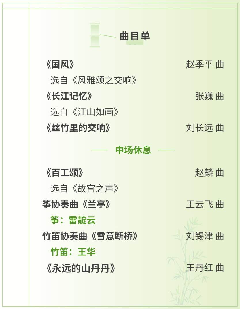4月12日,中国歌剧舞剧院民族乐团将聚焦“时代交响”创作扶持计划多年积淀的优秀成果,由指挥家洪侠执棒中国歌剧舞剧院民族乐团,呈现民族管弦乐在当代语境中的多元探索。以国家山河为卷,以丝竹管弦为笔,勾勒出中华大地的南北互融之声:《国风》蕴藉典雅,《长江记忆》气韵壮阔,《丝竹里的交响》融江南丝竹于现代语汇,选自《故宫之声》的《百工颂》以音响织体致敬匠心传承,描摹首都奇观,筝协奏曲《兰亭》和竹笛协奏曲《雪意断桥》更以独奏与乐队的对话,描摹南方山水意象、映照人文情怀,《永远的山丹丹》则以炽热的情感,北上黄土高坡,为整场演出画上浓墨重彩的收束。