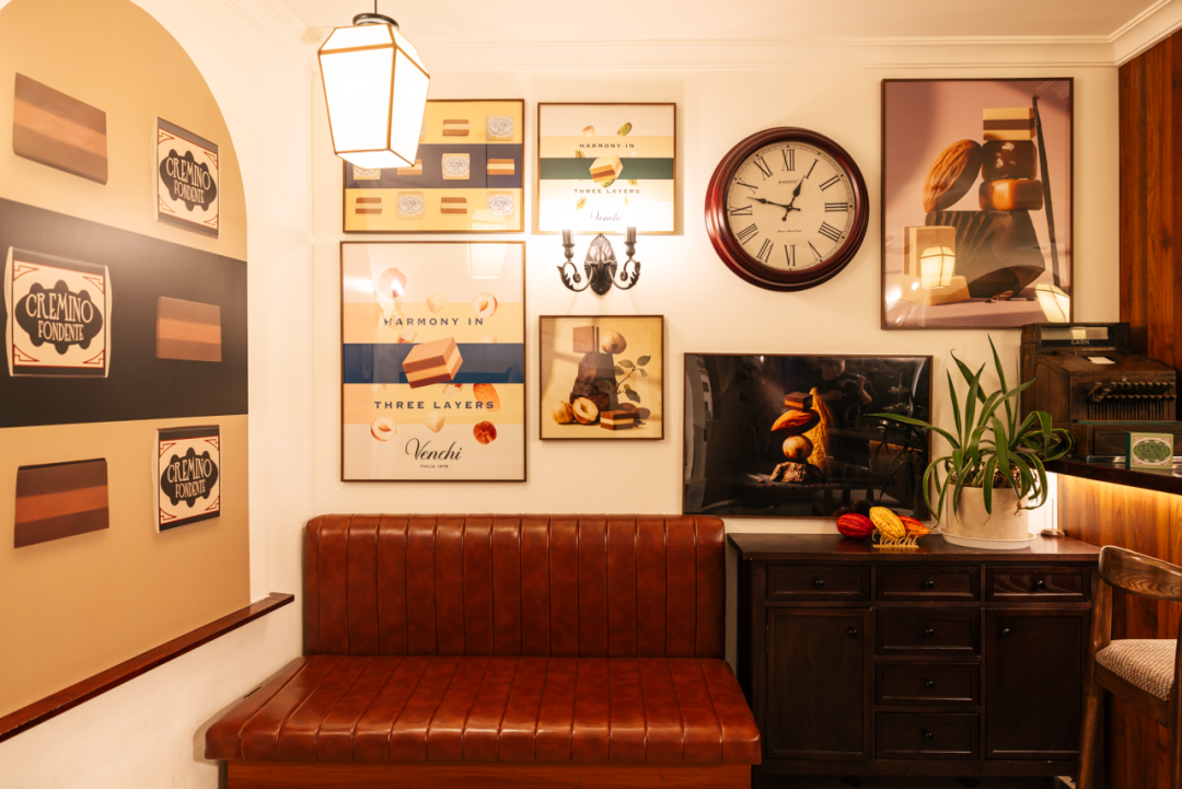 迈入其中,COA整体空间限时化身为Cremino专属风味实验室。转角扶梯两侧,Cremino小方块的装饰画依次铺陈,拾级而上,一步步解锁Venchi的百年匠心。
