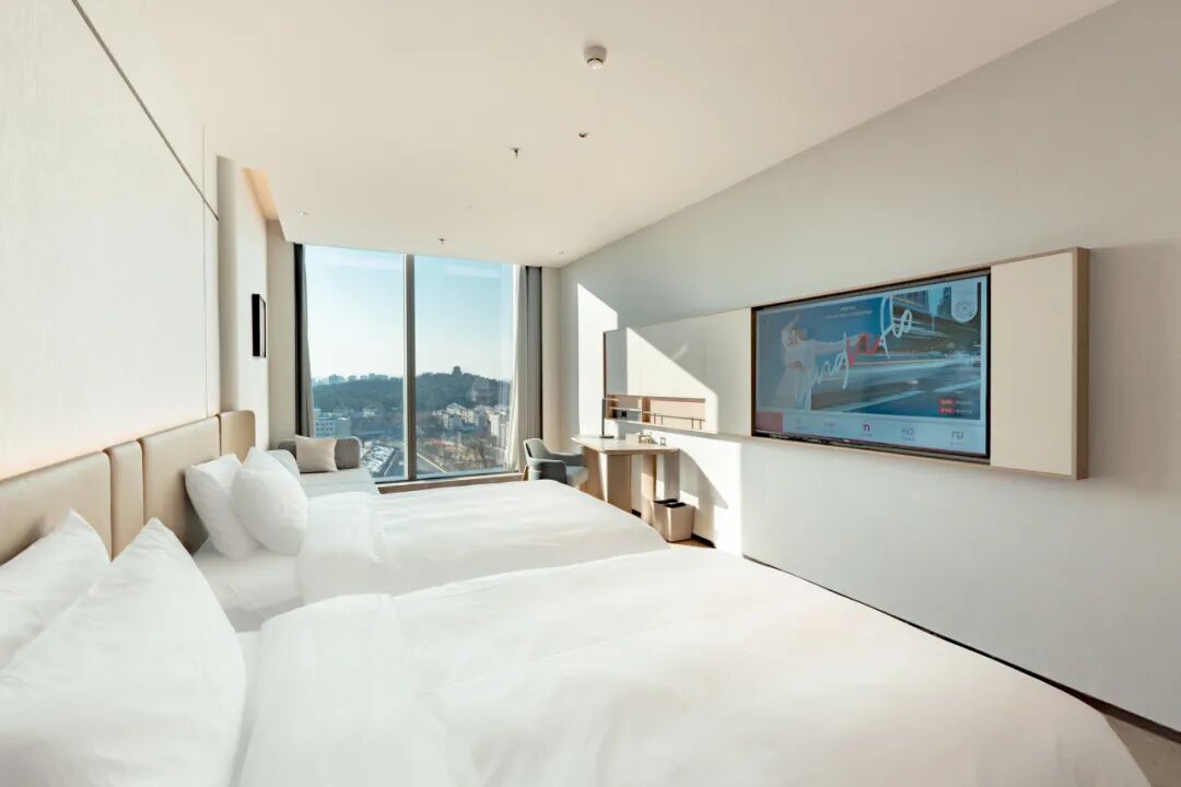客房以原木温润色调铺陈空间,光线通透而不张扬,一进门便卸下旅途的疲惫。65寸高清智能电视、大牌舒适床品与迷你吧等标配,让旅途更加舒心。