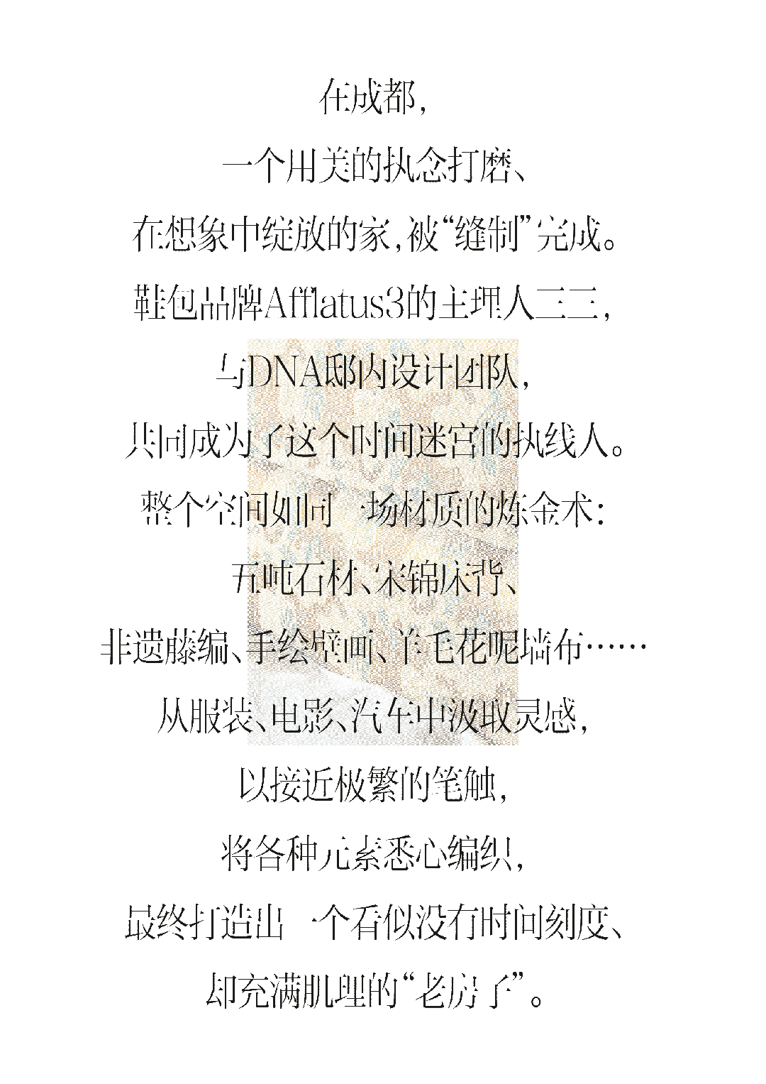 “长大后我要做服装设计师。” 小学课堂上,三三说过这一句话,如今她真的实现了梦想。事实证明,设计对于她确实有着宿命般的牵引力。虽然命运之手也曾犹疑过,并未将三三直接引向她心心念念的设计领域求学,但从英国留学归国后,她放不下自己的心愿,创立了自己的鞋包品牌Afflatus3,在经年累月的眼光淬炼后,这份对材质的敏锐已锻造成一种本能,当她开始构想自己的家时,对美的本能便显示出它的力量。