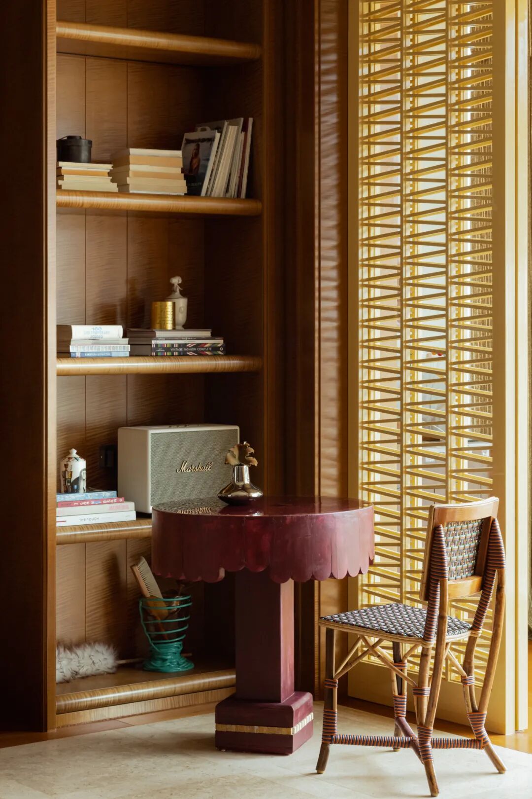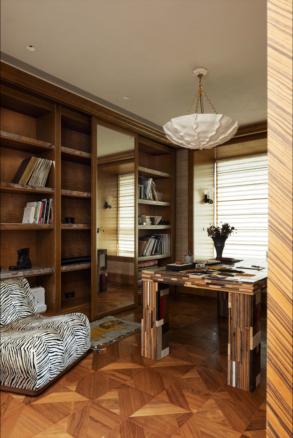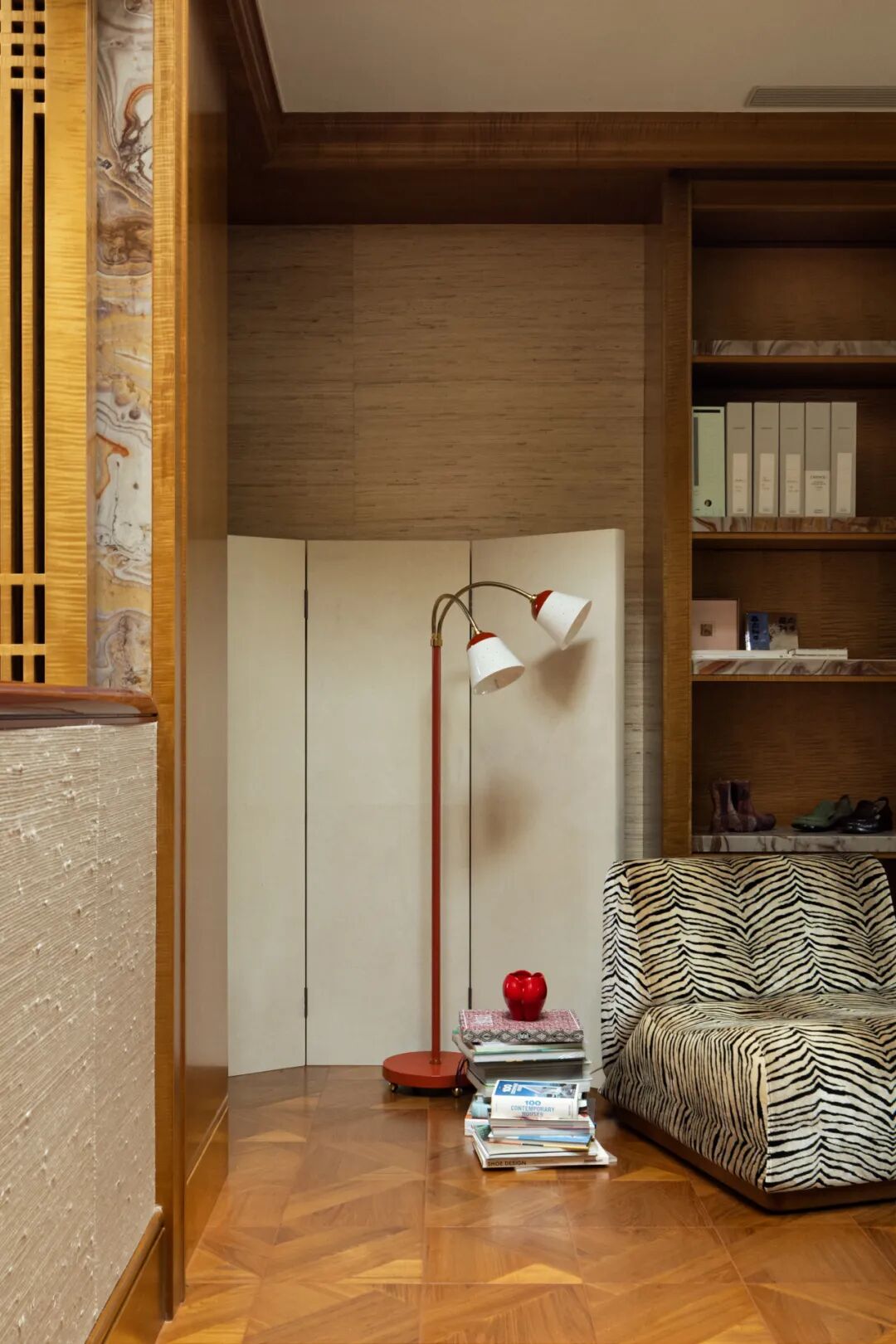 表面上的“极繁“并没有以形式主义和冲突感呈现,而是在牢牢把握空间结构感的基础上,对材质进行雕琢和冶炼——犹如一场空间的炼金术,置于同一空间熔炉中反复调和,直至它们彼此驯服,呈现出富有层次的质感光谱。设计师用木质的扎实线条与体块,勾勒出书架与墙板的轮廓,它们如同空间的骨骼,在石材、金属与织物的杂糅间,提供了一种沉静的秩序,让所有的“繁”皆有所依。