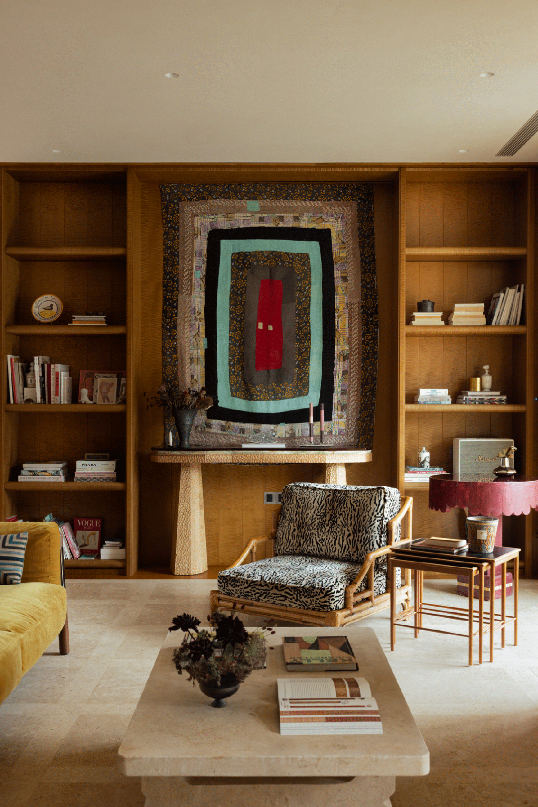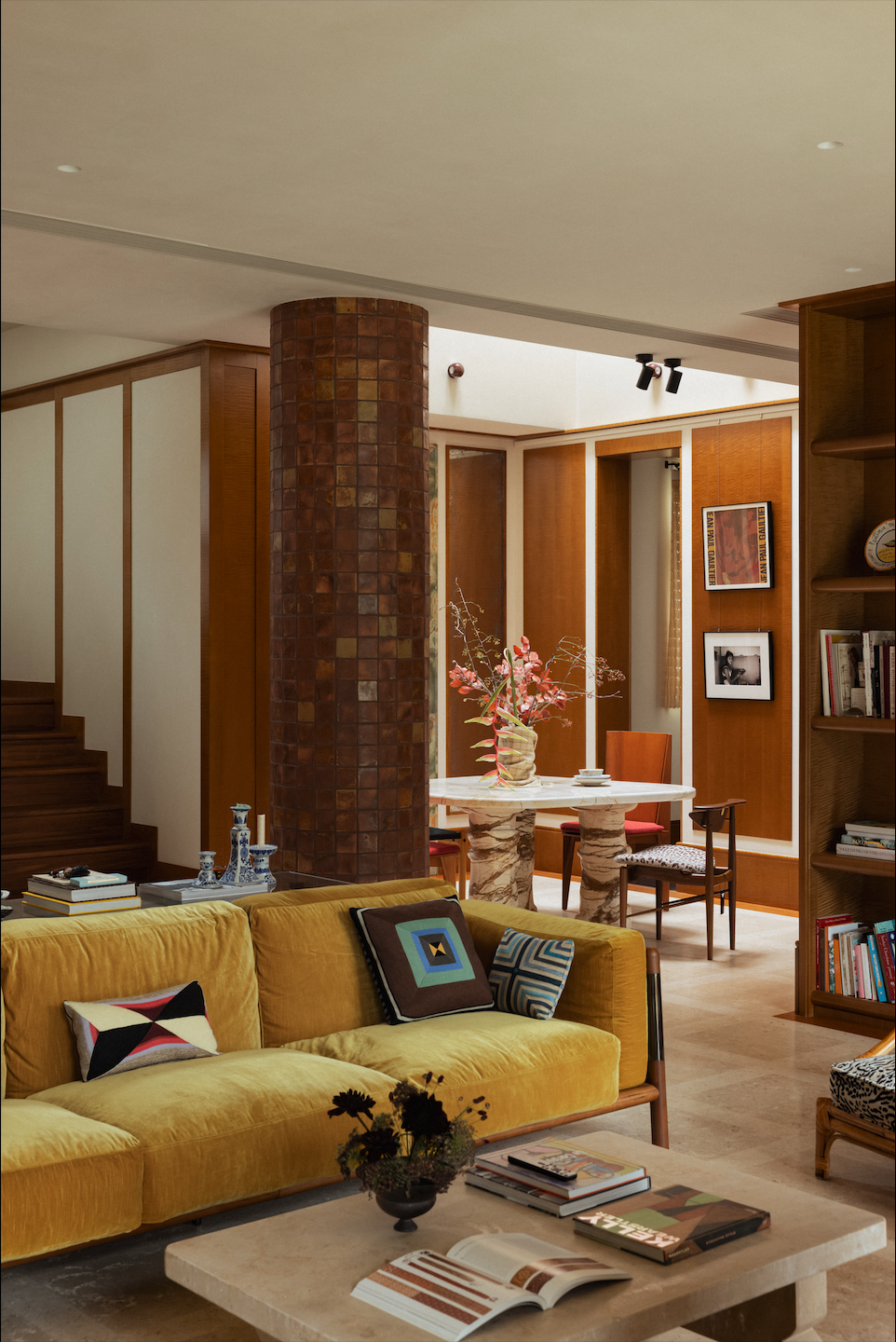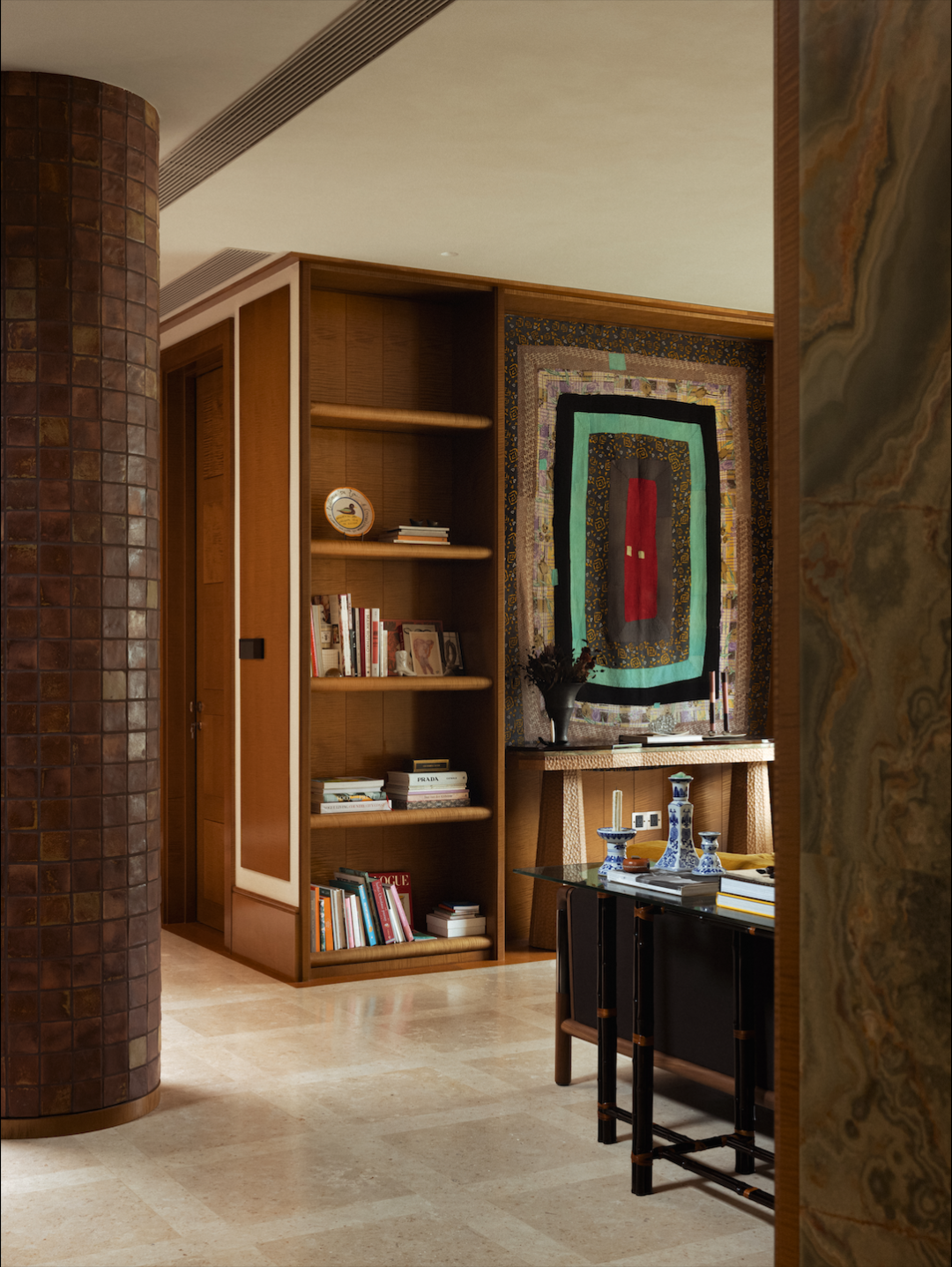 表面上的“极繁“并没有以形式主义和冲突感呈现,而是在牢牢把握空间结构感的基础上,对材质进行雕琢和冶炼——犹如一场空间的炼金术,置于同一空间熔炉中反复调和,直至它们彼此驯服,呈现出富有层次的质感光谱。设计师用木质的扎实线条与体块,勾勒出书架与墙板的轮廓,它们如同空间的骨骼,在石材、金属与织物的杂糅间,提供了一种沉静的秩序,让所有的“繁”皆有所依。