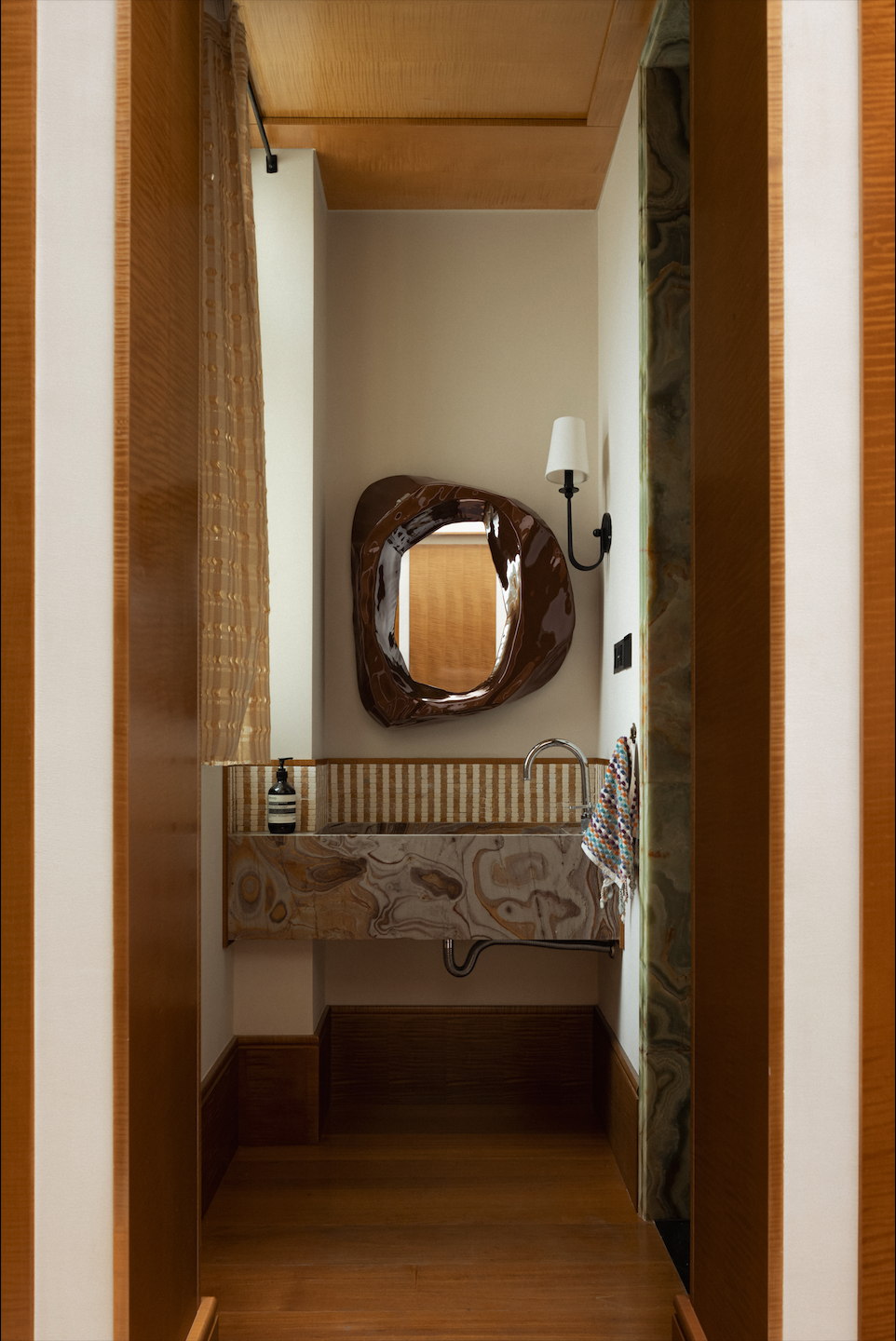 主人对“怀旧”审美的迷恋,不局限在复古酒店和室内,三三从1970年代的保时捷跑车上汲取了一种浓郁的“松露巧克力”色,并将它投射在了这面2025年的浴室镜上。原来美与美之间,竟是这样沉默地相通,早有灵犀,只待一个看见它的人,轻轻牵线。