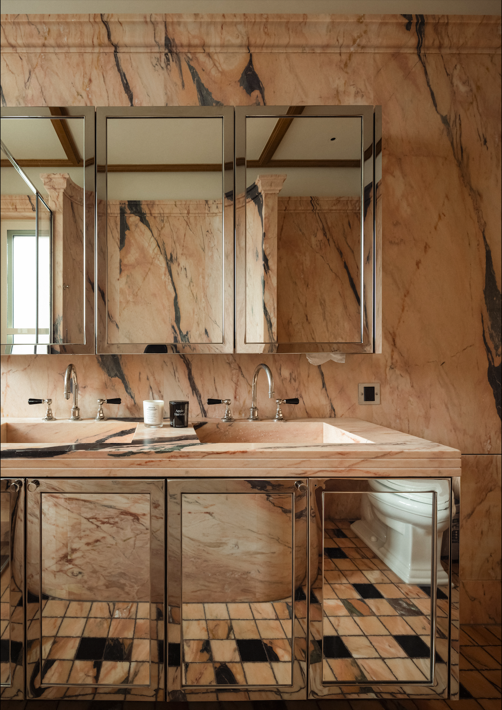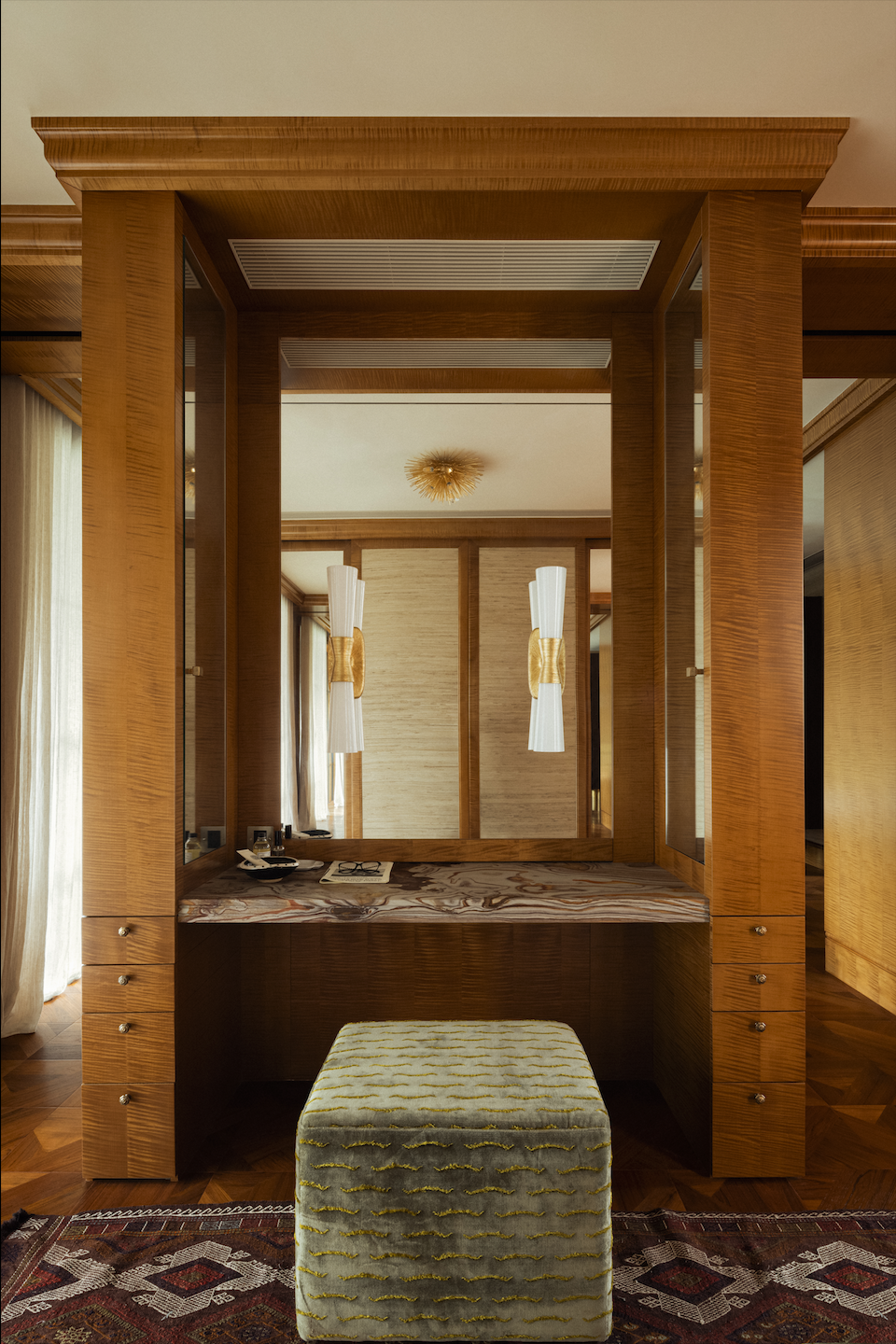 梳妆台同样利用了屋主预先准备的石料“布雷西亚”,金、木、石、丝构成的和谐乐章令人想起米兰的Villa Necchi别墅。