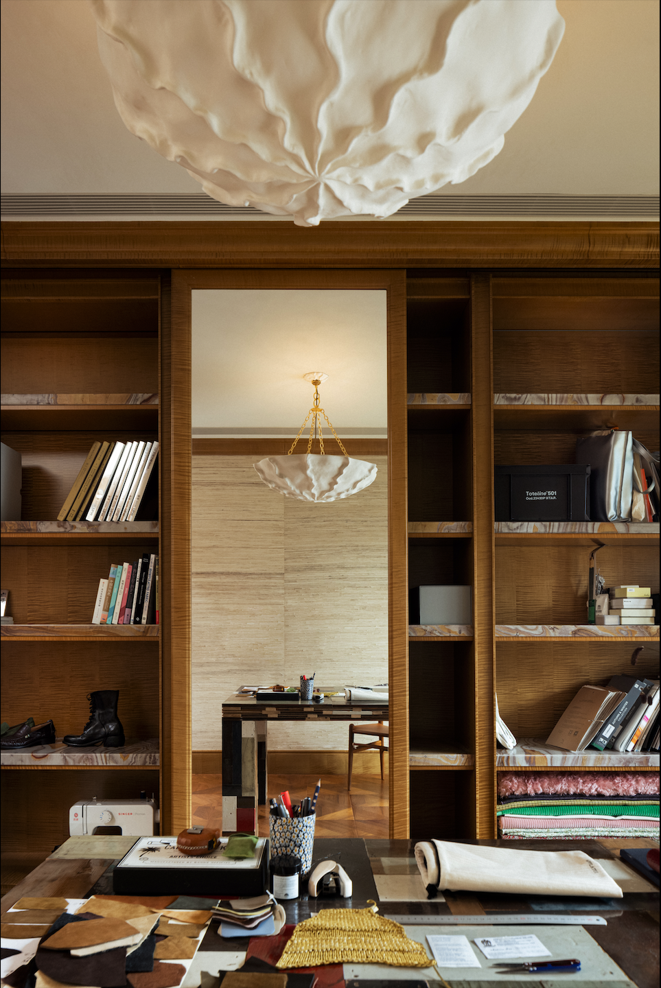 三三在家中的工作室空间,这里收藏了她手机相册里装不下的灵感切片,也是日常Afflatus3品牌的造梦空间。细密的肌理无所不在,书架上的层板来自三三屯集的布雷西亚大理石。