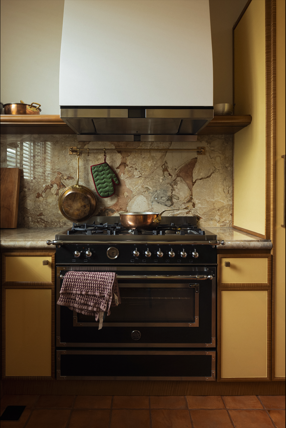 厨房被调成了一幅欧洲旧画。高光面板的芝士黄与棕色框线碰撞,调子温厚,像老电影里的场景。老式六星灶是她在欧洲旅游时心心念念想要带回家的“超级玩具”,不论厨艺深浅,只要站在它面前,转动旋钮的“咔哒”一声,便仿佛接上了某条时光的暗线,觉得自己像个百炼成钢的 “星级大厨”。