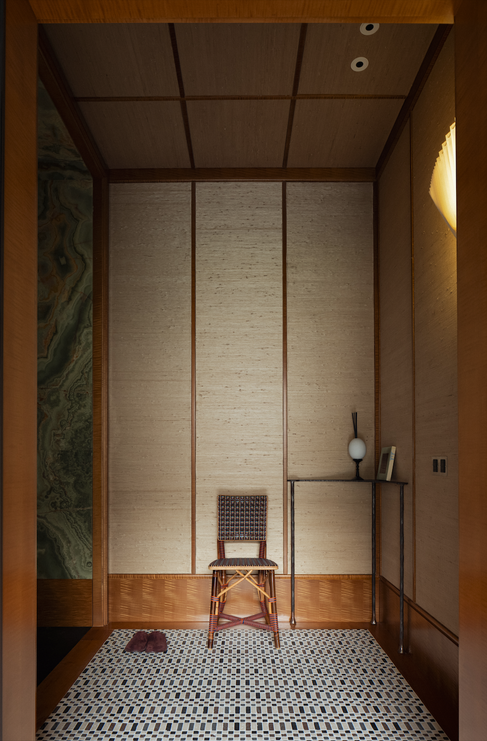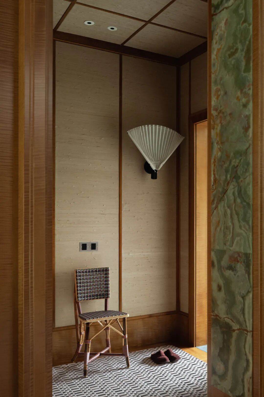 入口以黑白马赛克地砖界定出一块方方正正的玄关,墙面上,木架内嵌入了寻觅而来的亚麻墙布,像一块三折屏风,麻布上天然的织物结节给人一种“穿旧”的错觉. 古青玉镶嵌的门框,绿如深潭,带我们走进客厅。