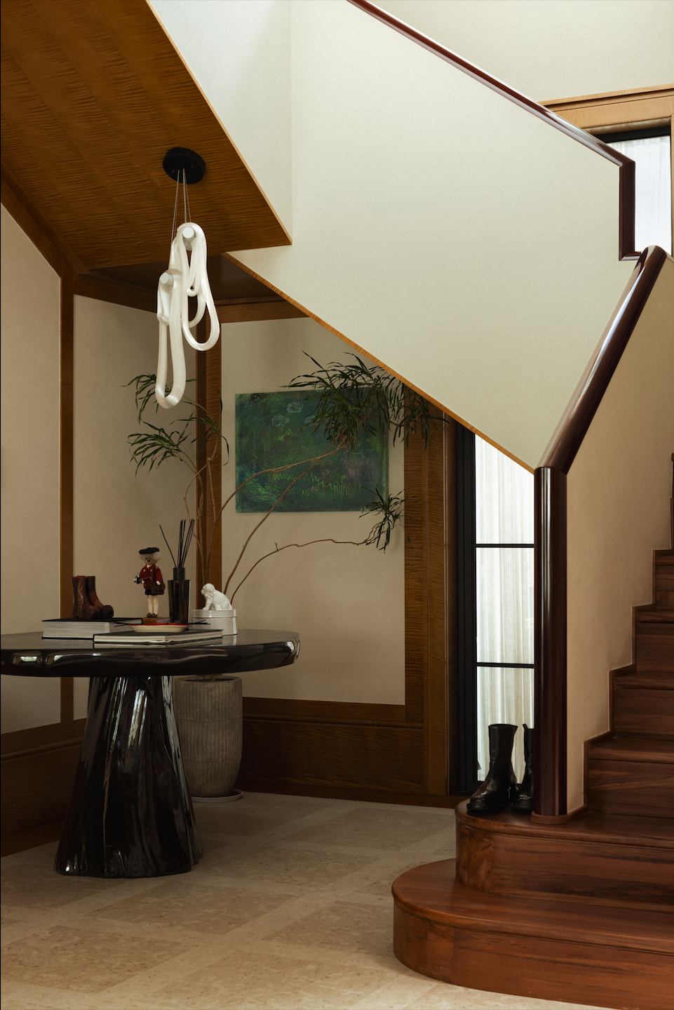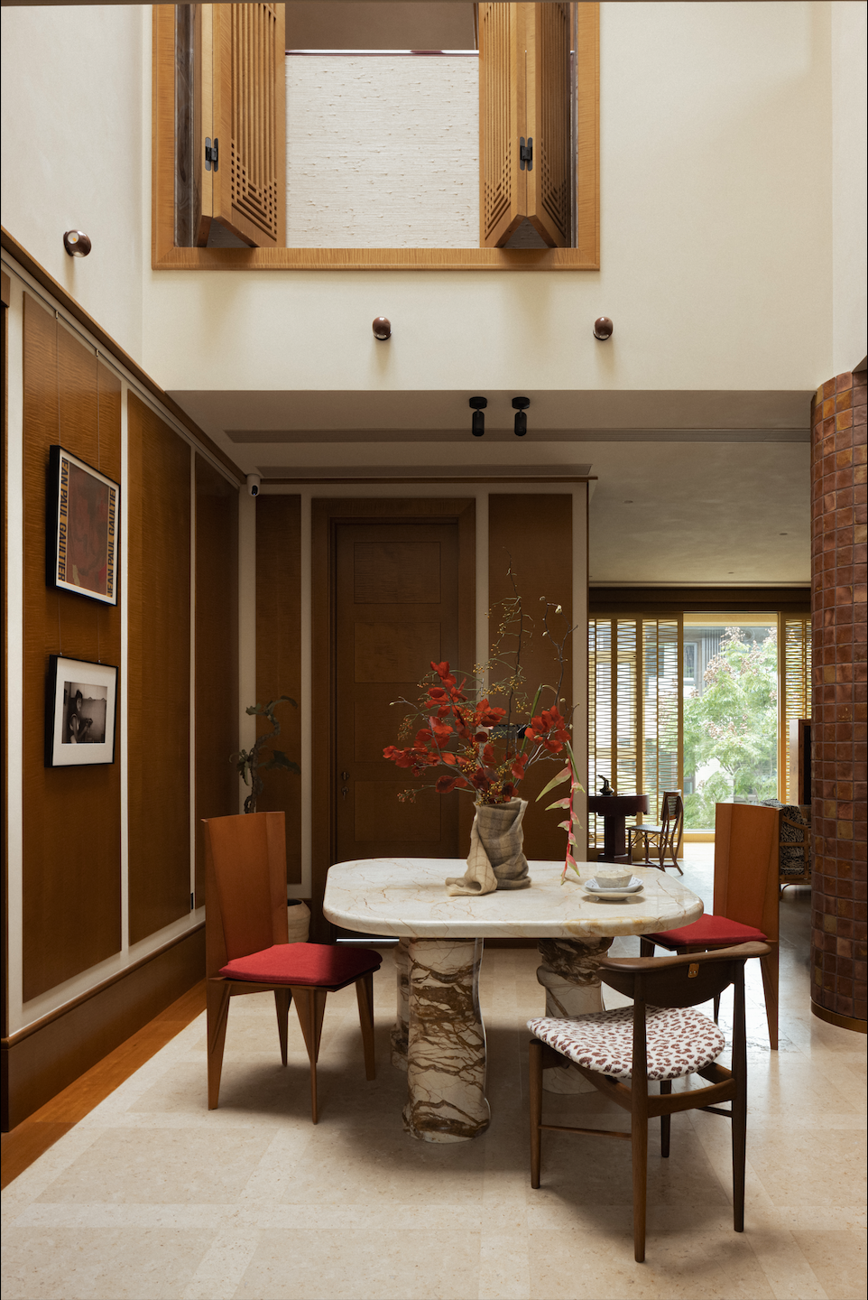 为了满足成都人的“向日葵”属性,为此,DNA邸内的设计师优化了采光,将原本的楼梯中井与藏在深处的餐厅对调了位置。如今,天光可以毫无遮挡地倾泻在餐桌中央,每日的早餐都浸在晨曦里。另一边,樱桃红色的高光扶手沿着楼梯蜿蜒而上,与楼下的圆桌悄悄呼应,像为空间细节镶了一道老派的滚边。