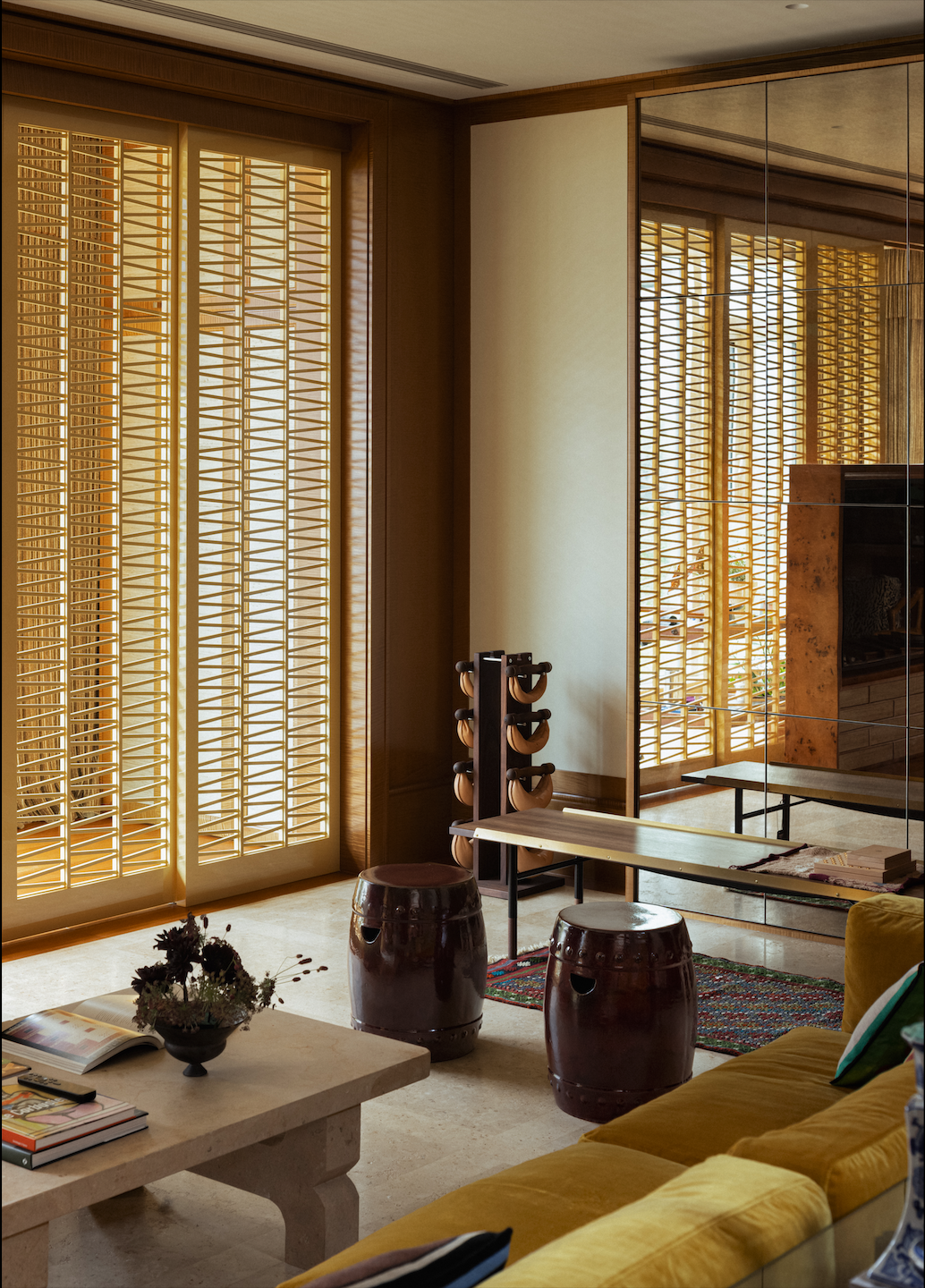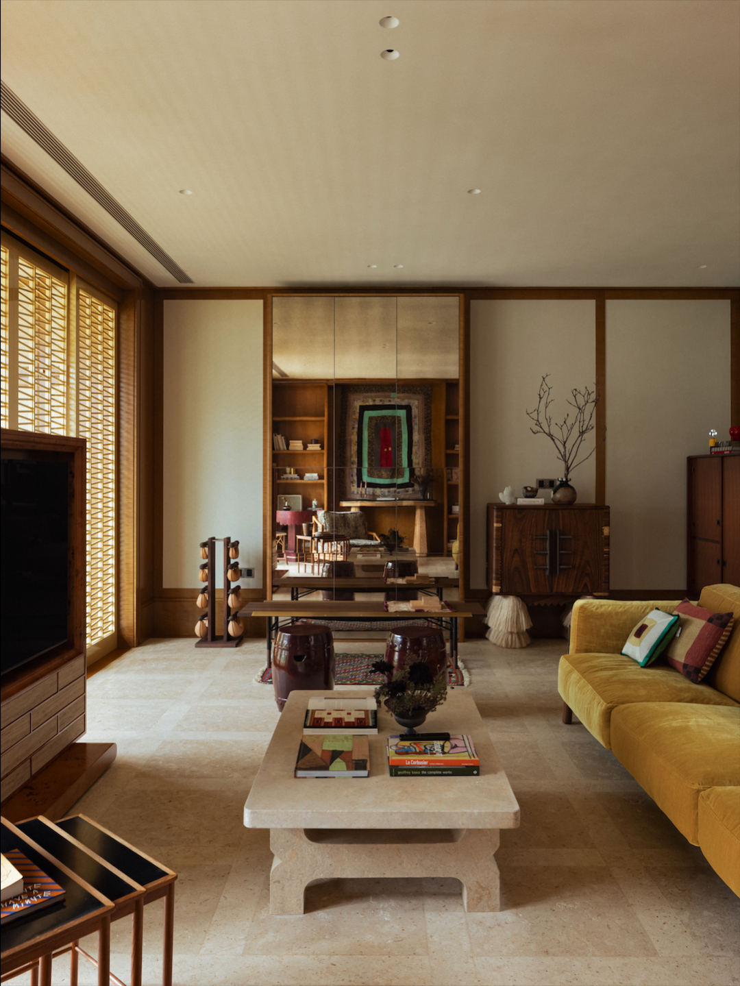 客厅色调明亮而丰富,地面用的是米色莱姆石,暗纹拼接,低调而有内在的秩序感。茶几用了与地面同色系的石料订制而成,造型灵感来自三三曾住过的一家法国酒店。