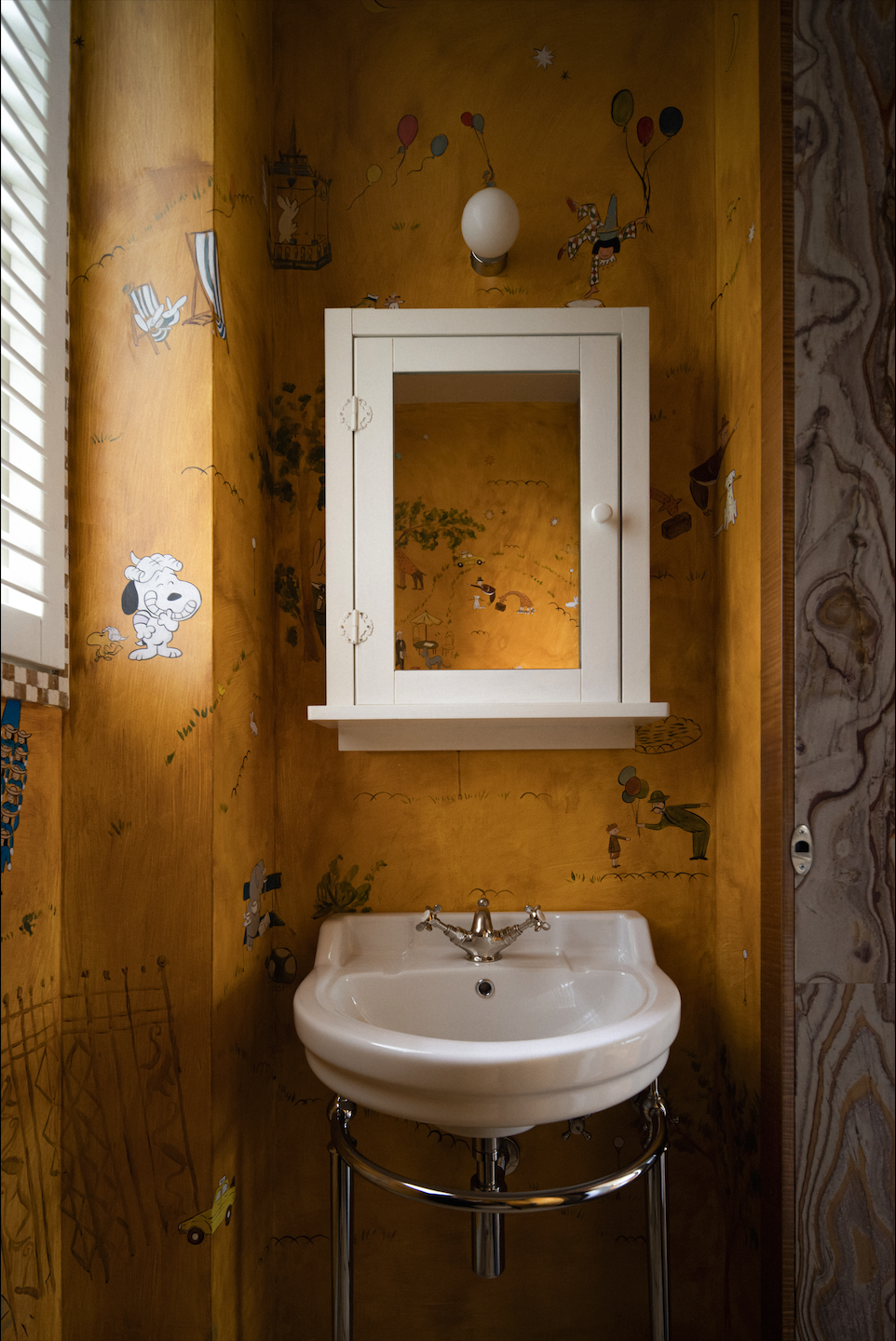 书房里的小卫生间是三三在工作间隙放空自己的一方冥想天地。电影《纽约的一个雨天》中,Carlyle Hotel酒吧Bemelmans Bar的绝美场景让三三折服,她喜欢Ludwig Bemelmans的壁画中的风趣浪漫,在决定壁画搬回家却求购无门之时,索性找了一位来自厦门美院的壁画师,在墙壁上临摹了Bemelmans的零散画作,也顺势加夹带了自己“私货”,比如自家的小狗“布丁”。