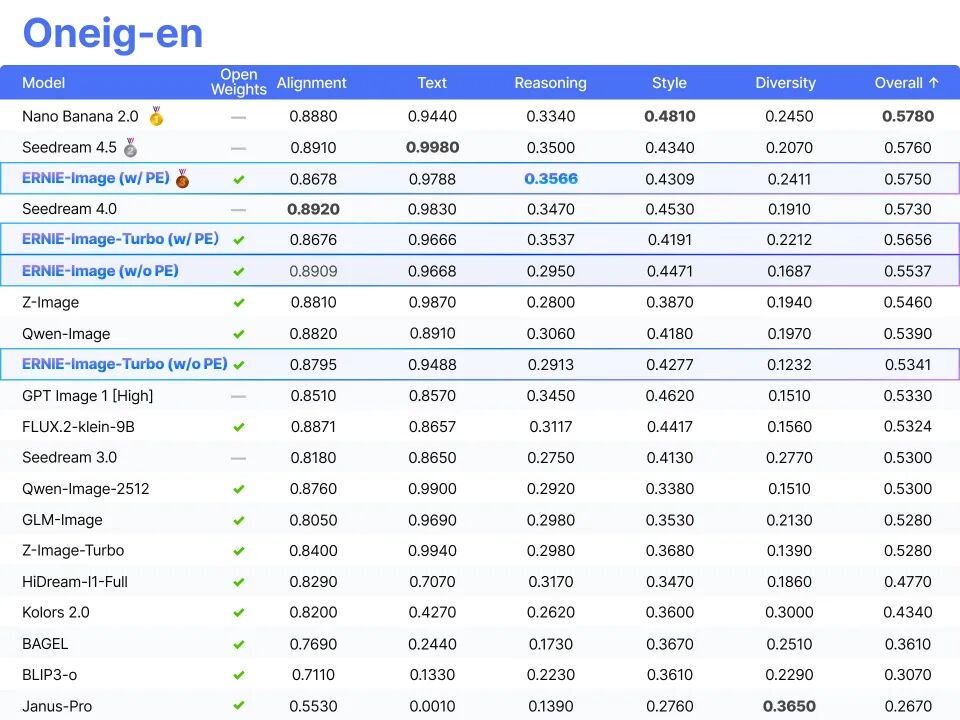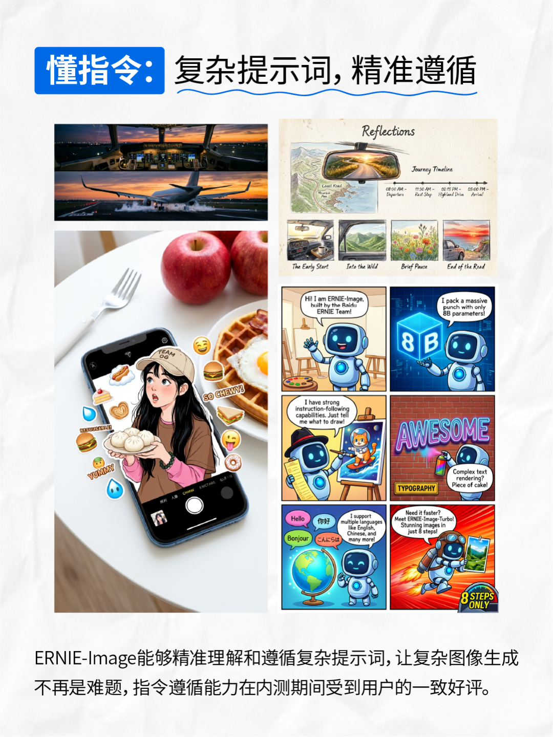 经过电影网、凤凰网、蜻蜓FM、瑛麒动漫、蜂鸟AI等30多个知名企业、社区和创作平台,20位艺术创作设计师为期两周的内测与反馈,今天,我们正式开源ERNIE-Image模型,参数量仅8B,24GB显存的消费级显卡即可生成媲美顶级商业模型的超真实、复杂图像。