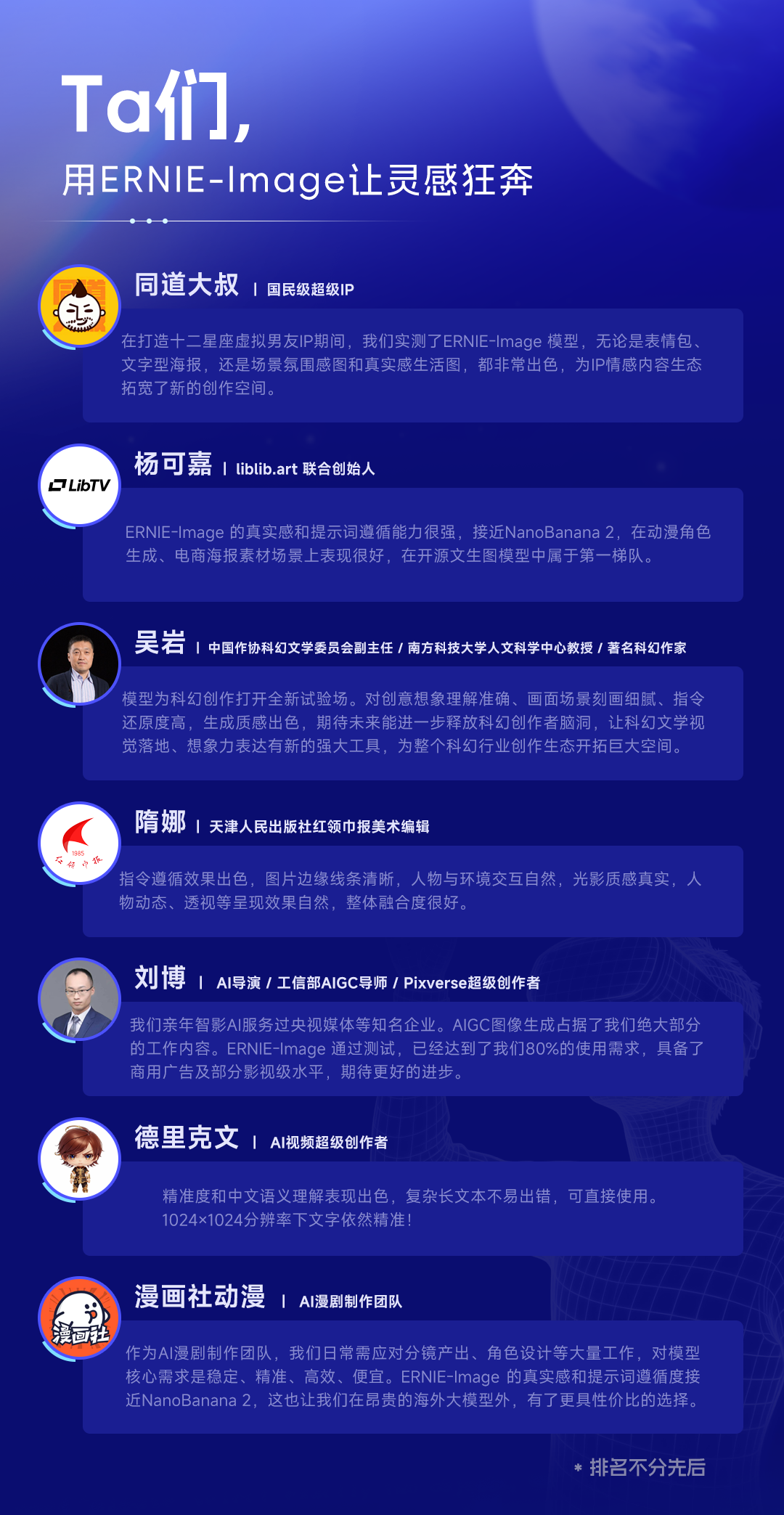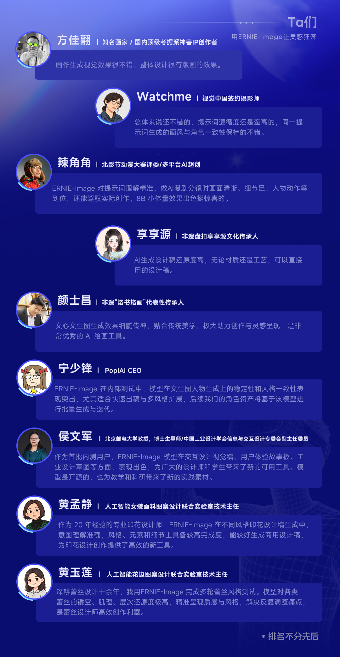 在ERNIE-Image内测期间,我们邀请了来自设计、动漫、非遗等不同领域的知名专家,结合实际应用场景对ERNIE-Image展开了测评,获得了众多好评。