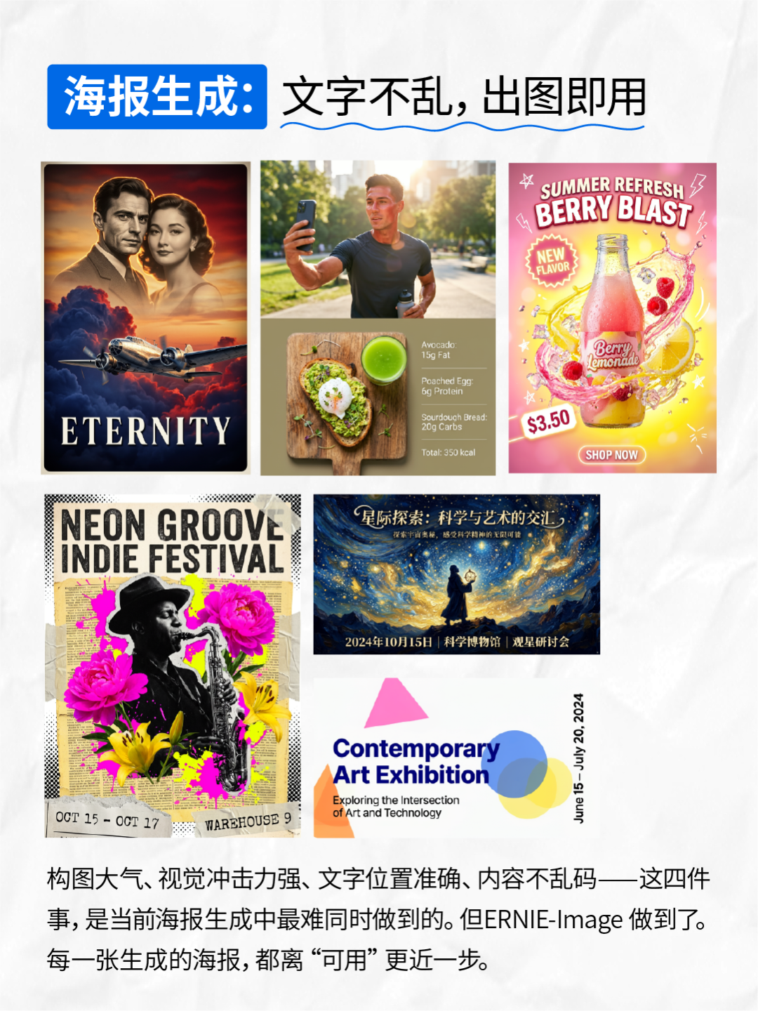 这组包含了海内外社区、知名设计师等在真实场景下的使用的展示图,全部由我们最新模型 ERNIE-Image 强力驱动产出。
