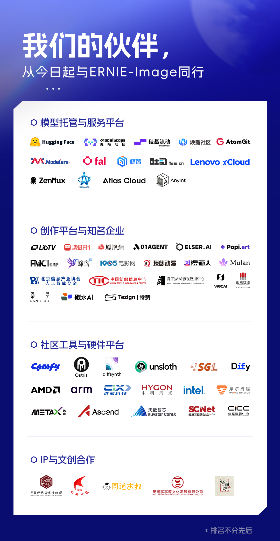 文心大模型生态伙伴也积极启动了模型测试与部署,截止目前,已有50余家模型托管与服务平台、创作平台与知名企业、社区工具链正式接入了ERNIE-Image。