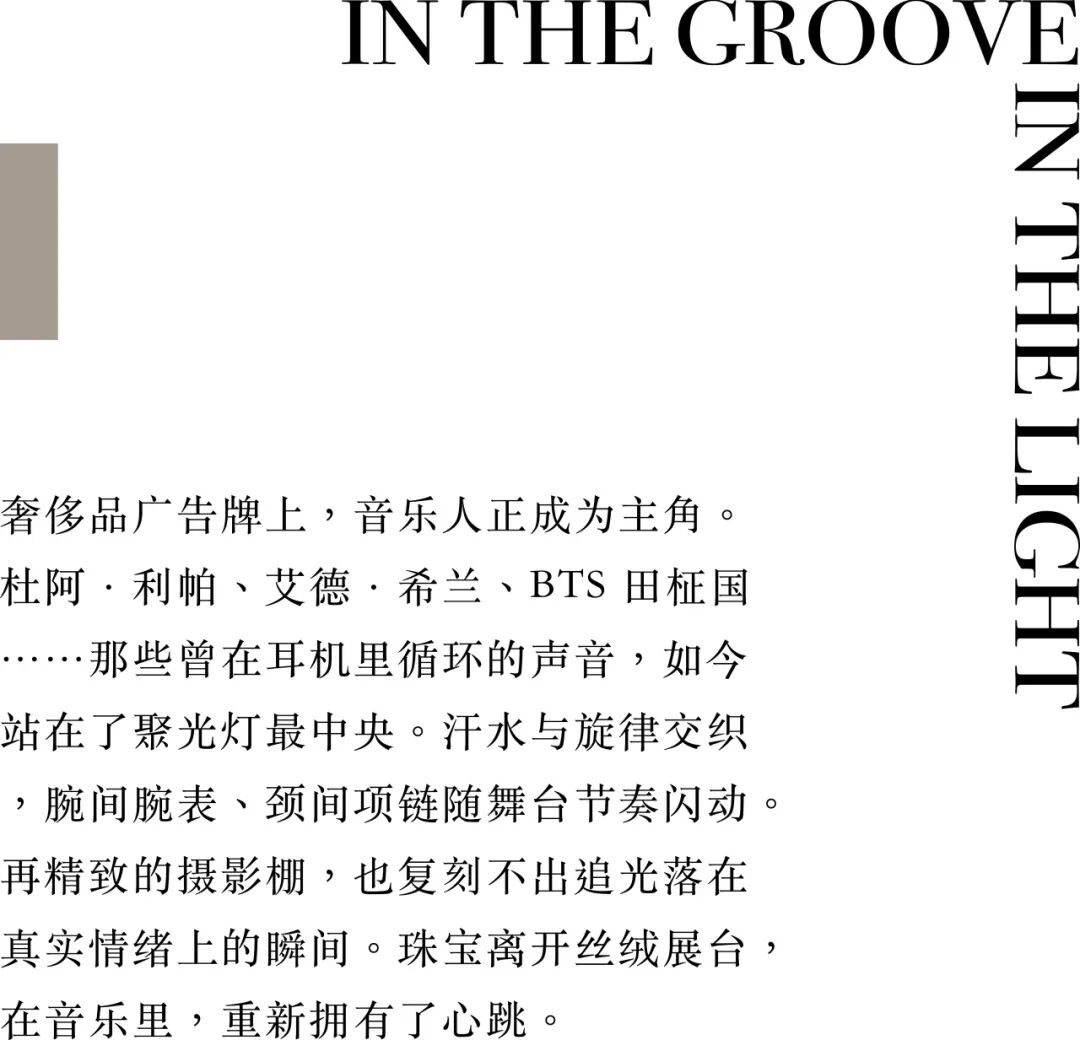 说到底,我们为什么会为这些“奢侈品×音乐人”的组合买单?因为在那些聚光灯下的画面里,我们看到了自己向往的状态,自信、自由、热爱、被懂得。音乐人把这种状态唱给我们听,珠宝或腕表品牌则把它凝固在可以触摸的作品里。当两者结合,产生的便是一种关于“美好生活”的关联想象。