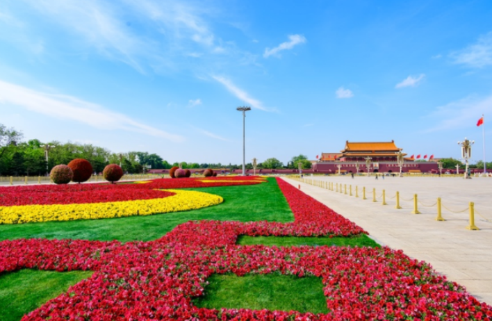 5月1日,在蓝天白云的映衬下,天安门广场花团锦簇,各色鲜艳花卉竞相绽放,以最美的姿态致敬劳动者。