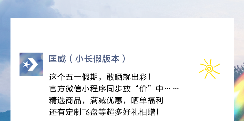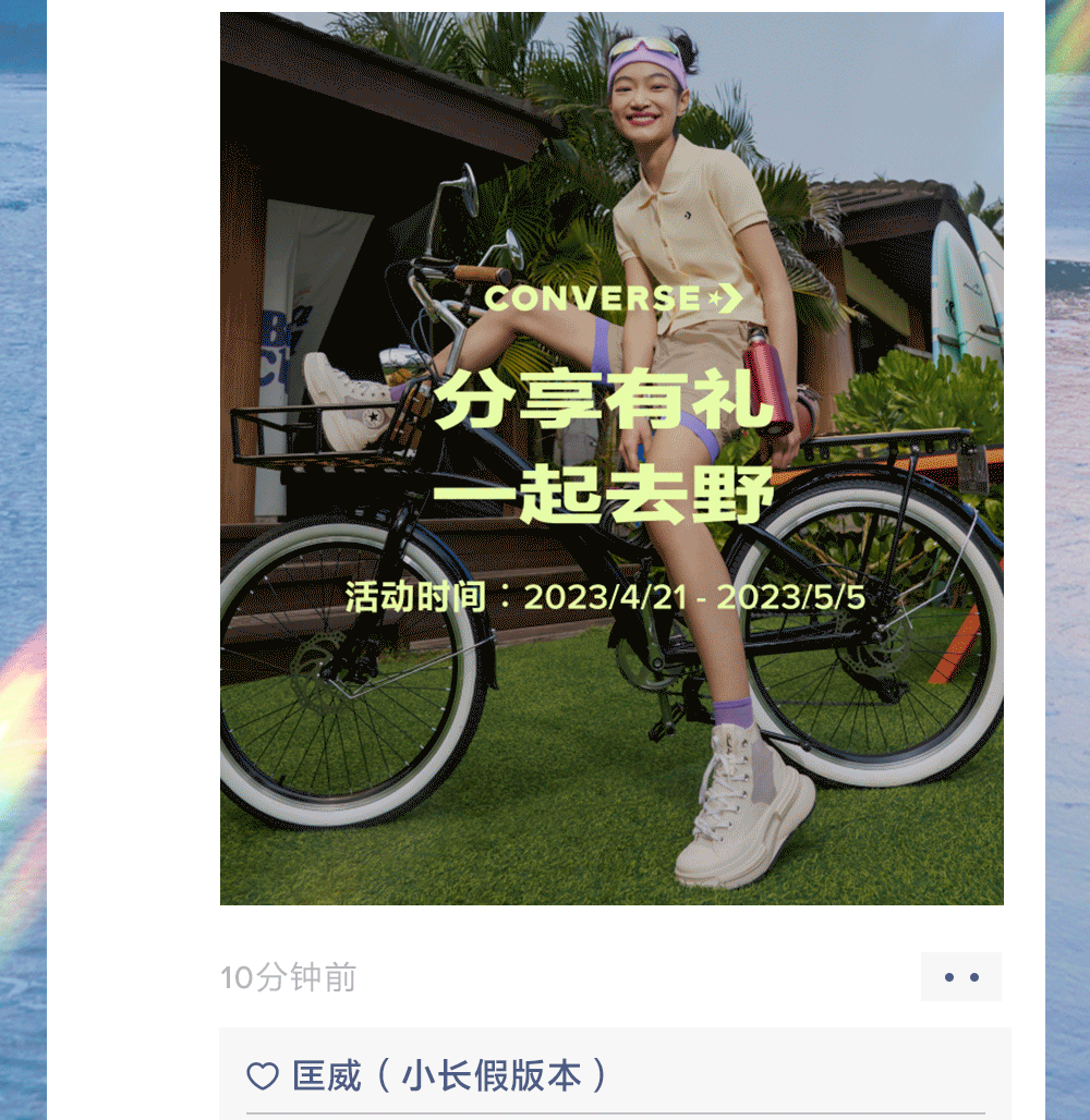 推荐:「点击消失后展开」模拟打开五一小长假的朋友圈,其中穿插介绍着的CONVERSE服饰,最后吸引大家报名线下活动。