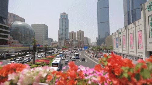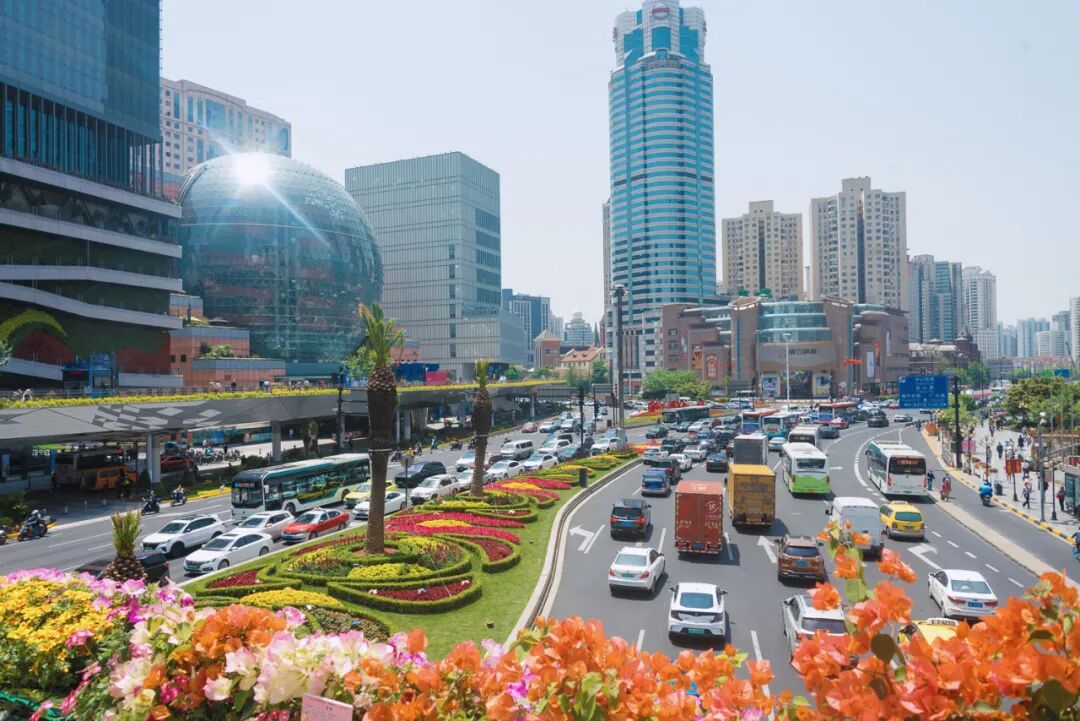 连接商场的天桥连廊两侧,摆满了各色娇艳花朵,引得路人纷纷驻足,拿出手机记录下片刻美好。