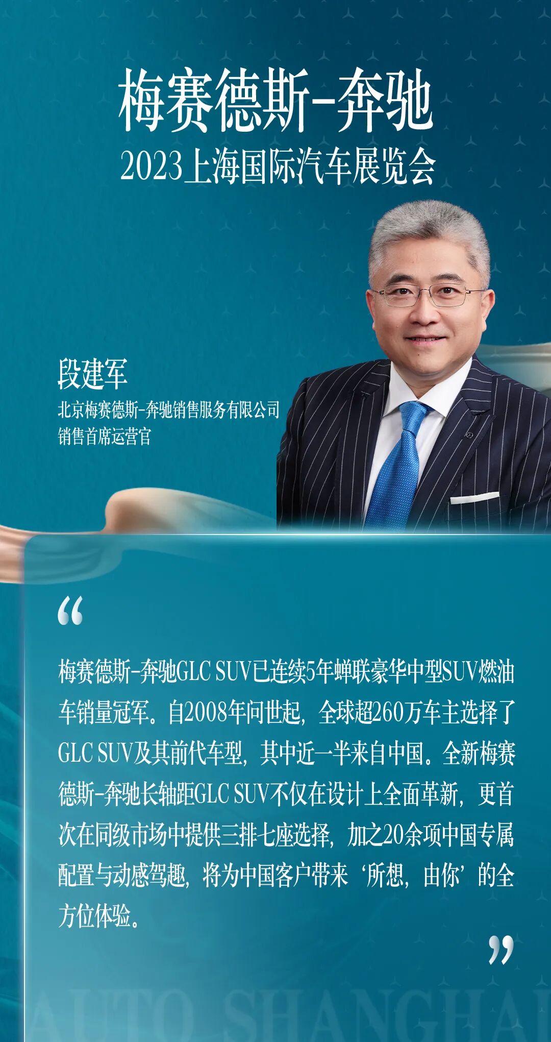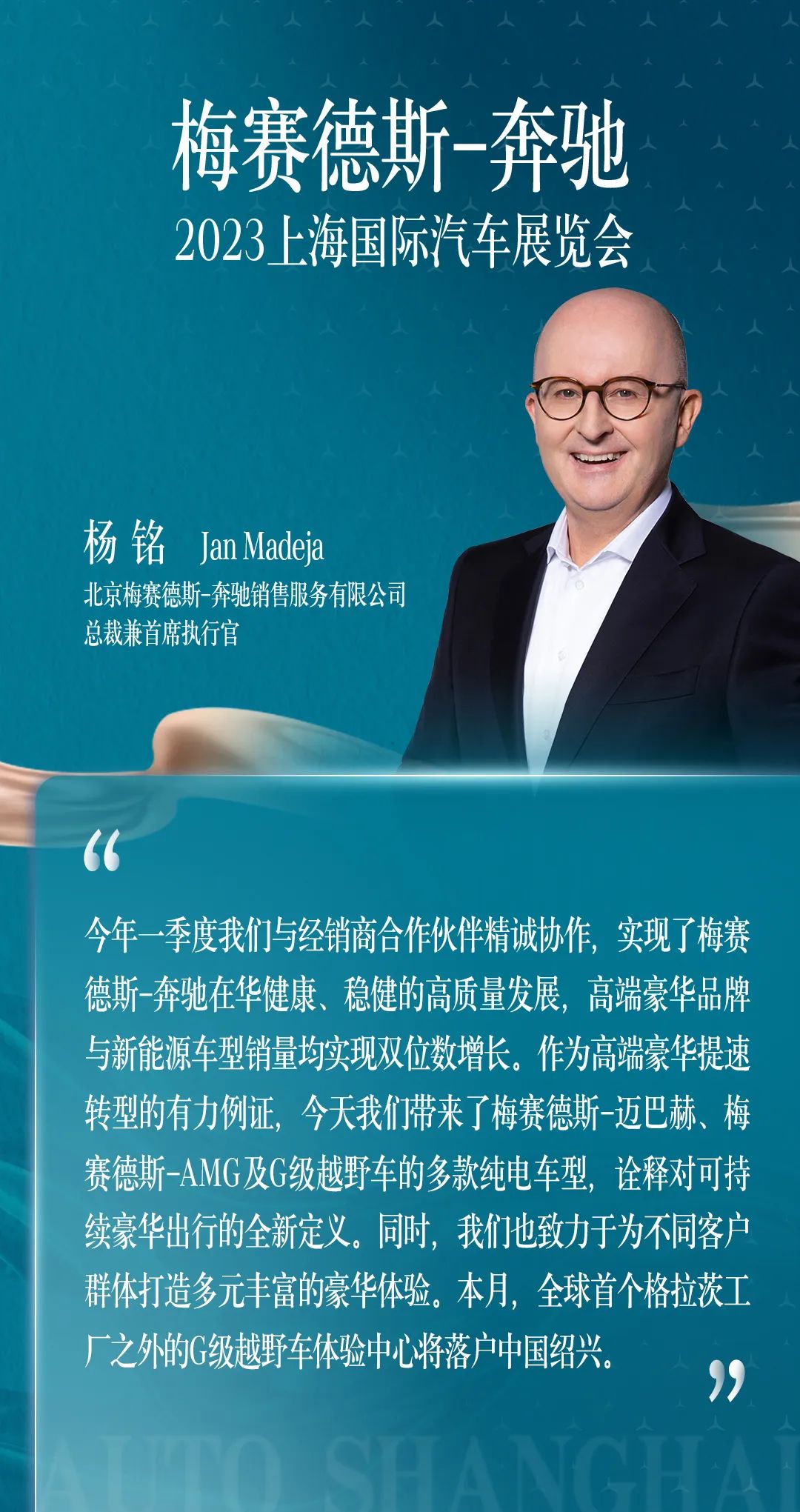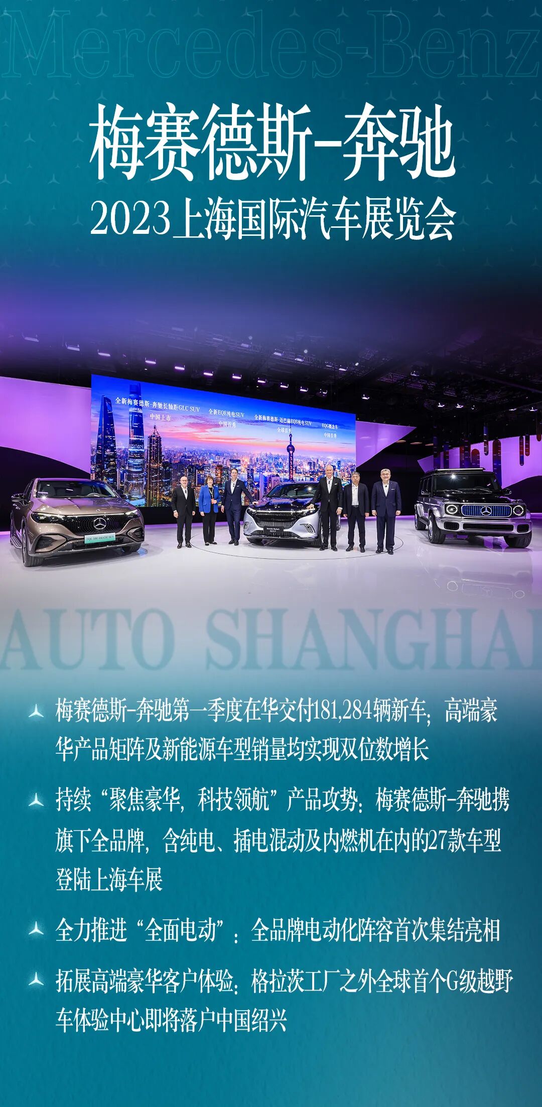 全“星”全意,矢志不移。立足于全方位满足中国客户需求,梅赛德斯-奔驰将持续“聚焦豪华”,提速“全面电动”,引领“科技驱动”,为中国客户打造令人向往的豪华品牌、汽车产品与服务体验,为可持续豪华的出行未来笃志前行。4月18日至27日,敬请莅临上海国家会展中心4.1号馆梅赛德斯-奔驰展台,美好出行,尽在于此。