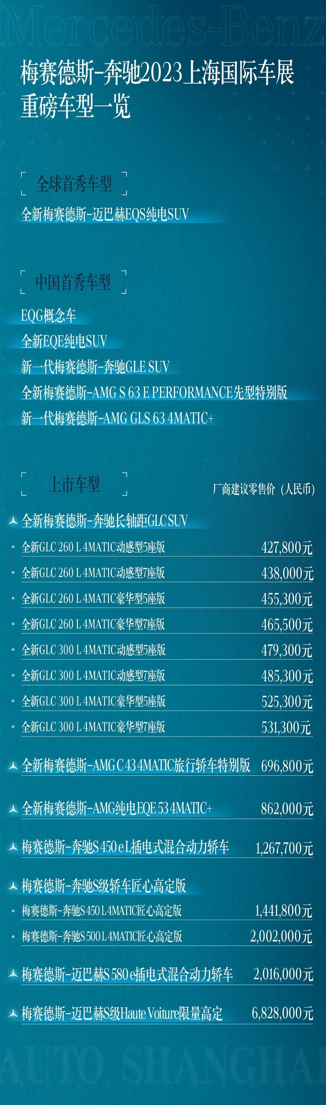 今日,梅赛德斯-奔驰携旗下梅赛德斯-奔驰、梅赛德斯-EQ、梅赛德斯-迈巴赫、梅赛德斯-AMG、G级越野车全品牌27款车型登陆2023(第20届)上海国际汽车工业展览会4.1馆,以1款全球首秀、5款中国首秀、7款上市的13款重磅新车阵容,书写“汽车发明者”不断超越自我、创领未来的宏伟蓝图。
