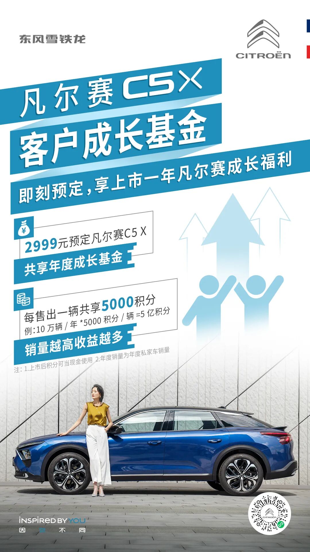 享专属礼:私人订制专属徽章; 超值购礼:500元超值选购高级黑色车顶及轻质铝合金行李架; 共成长礼:支付2999元的预定客户(含前期支付2999元的盲订客户)分享凡尔赛C5 X成长基金——即凡尔赛C5 X上市之日一年内,每卖出一台凡尔赛C5 X,都将与成长基金会员分享5000积分。