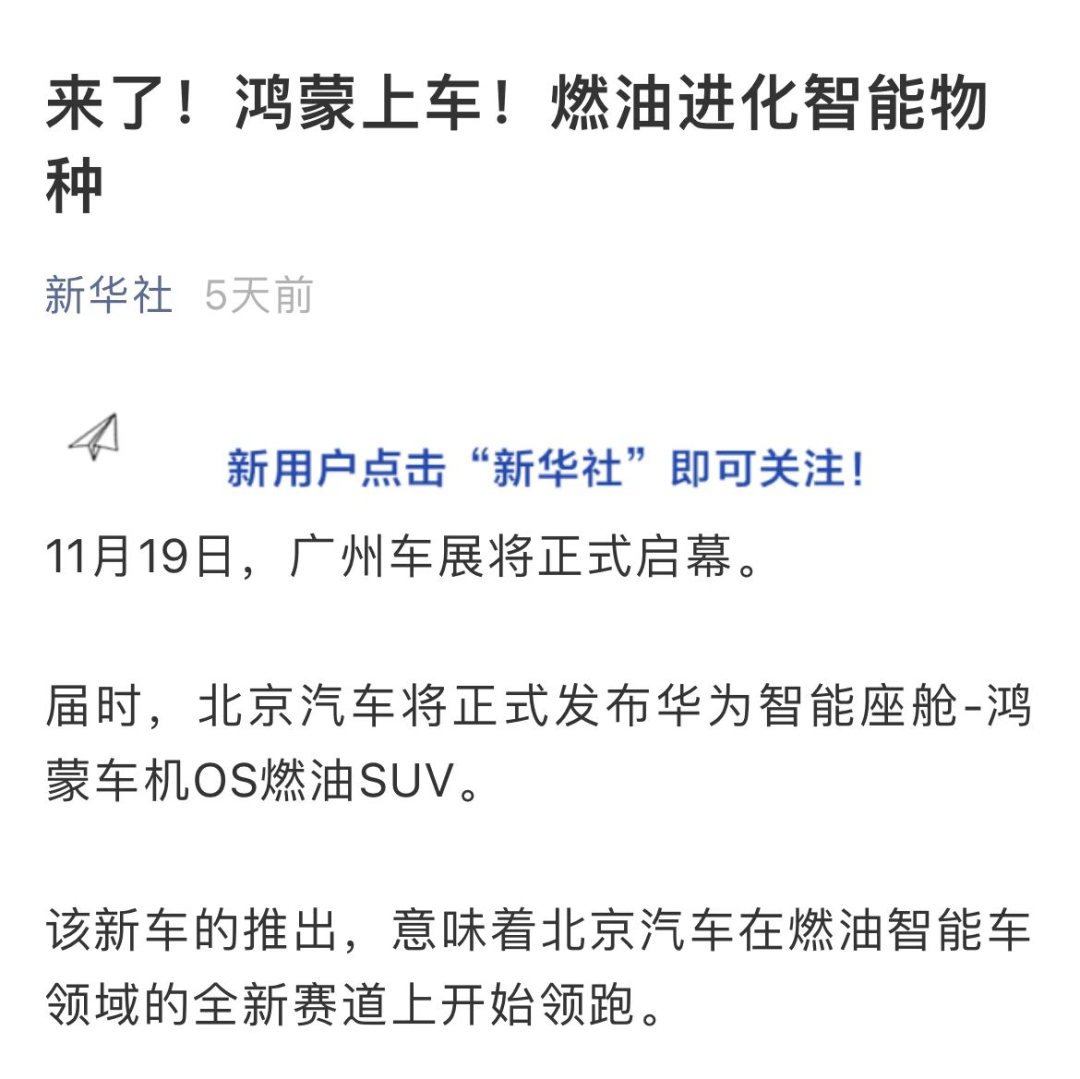 新华社这篇报道认为,在汽车产业形态、交通出行模式、能源消费结构发生巨大变化的当下,北京汽车于此时推出华为智能座舱-鸿蒙车机OS燃油SUV,有望在燃油车智能化发展的新起点上,展现出起跑加速的最佳姿态。