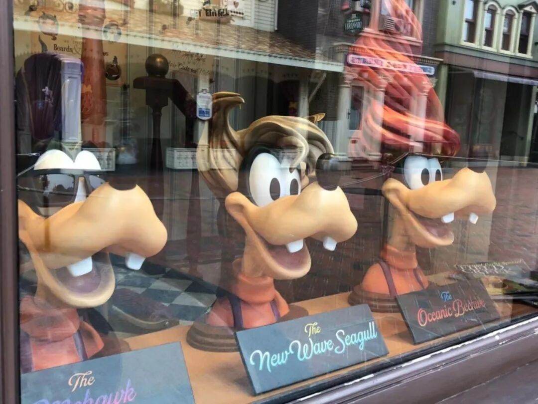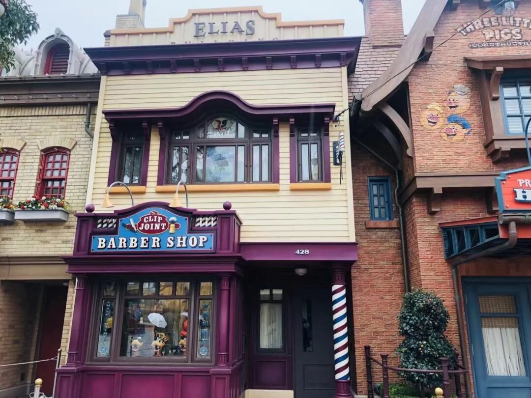 橱窗内最引人瞩目的就是高飞三款潮到没朋友的造型!不愧是高飞,米奇大街“男明星”!走到侧面往里张望,可以看到理发店的全貌,猜猜上一位客人是?