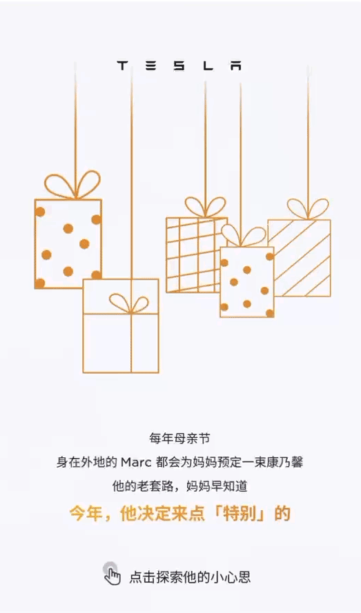 「点击切换GIF动图+展开」母亲节给妈妈们准备的五重特别心意,借此宣传特斯拉的五种特色功能,吸引大家使用。