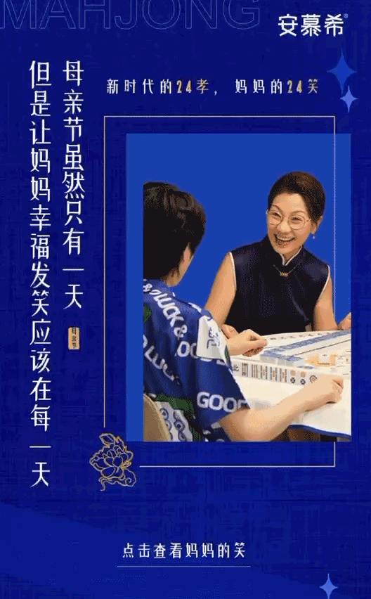 「连续点击切换GIF动图+点击展开」查看妈妈的笑,借此宣传四川观察联手安慕希制作的“安慕希妈妈24「笑」麻将”。