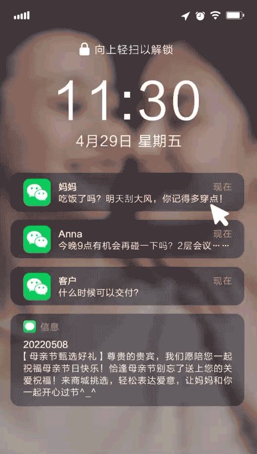 特仑苏通过「点击左移并展开」的交互形式模拟查看手机上的微信消息,吸引大家上传自己和母亲的照片并参与H5互动抽奖活动。