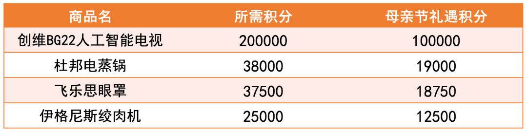 本期,小珠为大家优选了四款积分商城的礼品,在母亲节当天可以积分五折兑换。参与方式为先用积分兑换后,小珠后台为大家返还。每款商品限前5名,以后台下单时间为准: