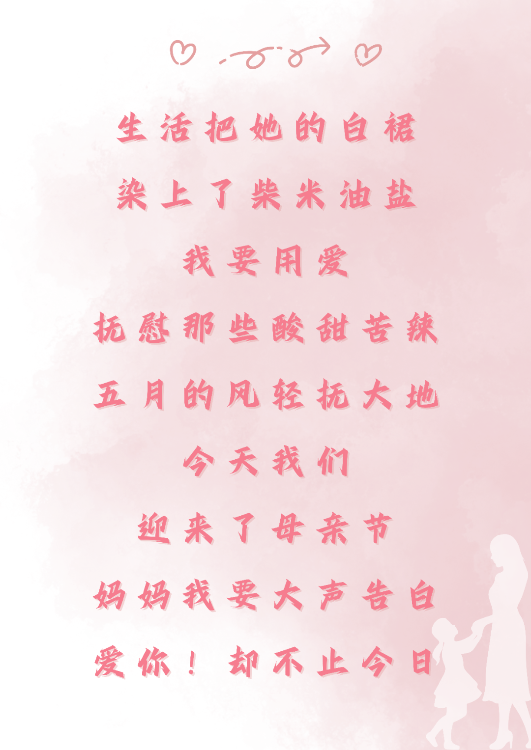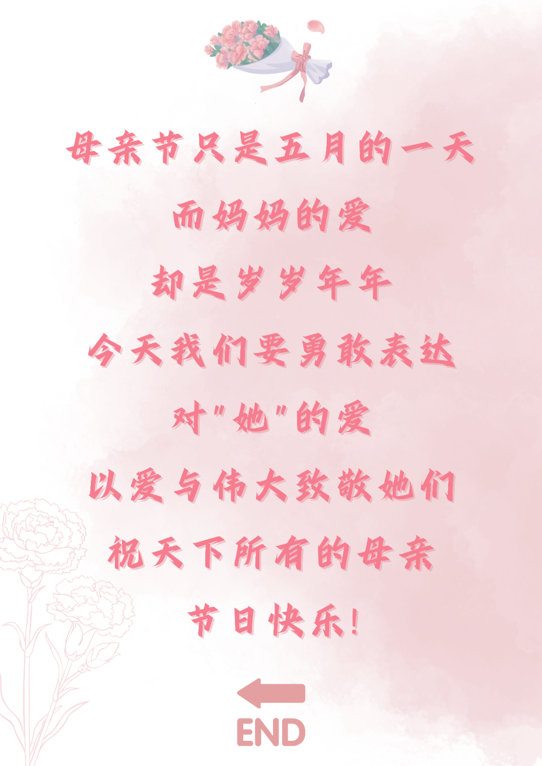 无论我遇到什么困难,妈妈总是第一时间无条件地站在我这边,给予我无尽的支持与关爱。母亲节到来之际,我想对妈妈说,我真的很爱很爱你。这份爱太满,无法用言语完全表达出来。我衷心祝愿妈妈天天开心,身体健康,永远幸福安康!