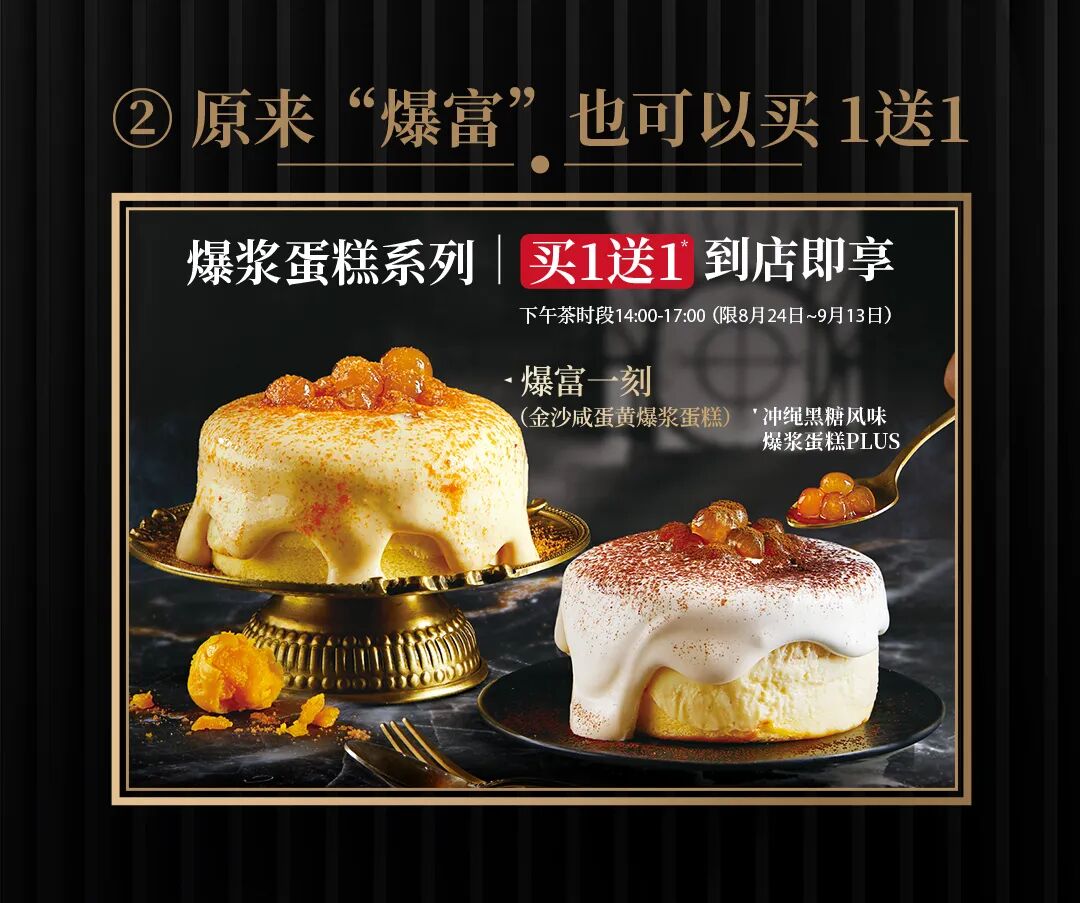 爆浆系列是爆富一刻(金沙咸蛋黄爆浆蛋糕)、冲绳黑糖风味爆浆蛋糕PLUS,可享下午茶时段买1送1。