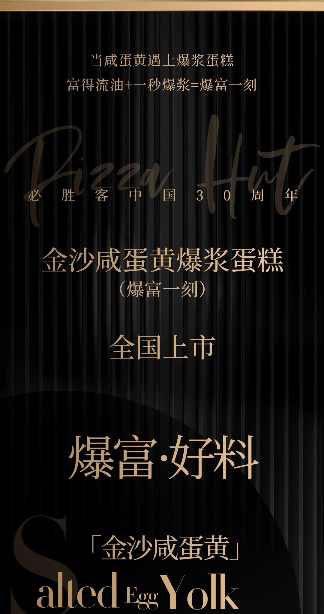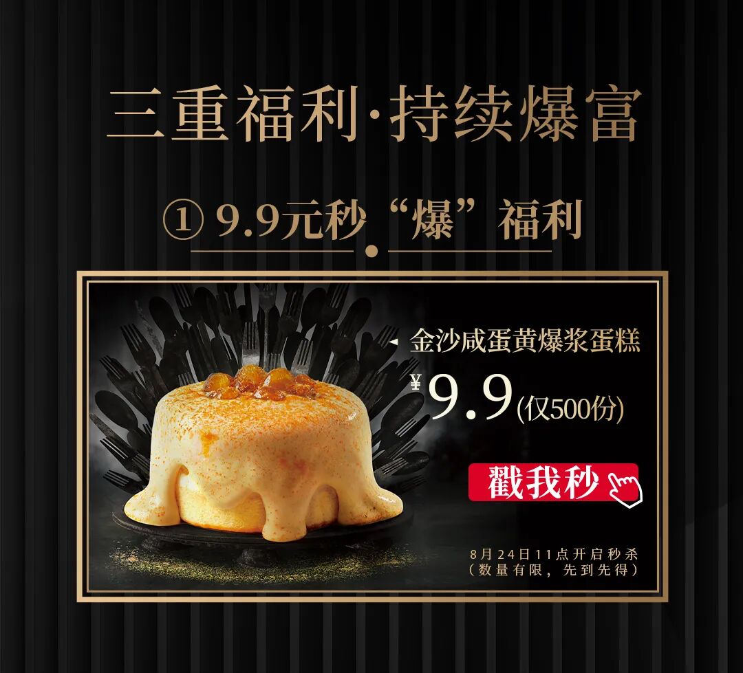 2020年8月24日11时,在必胜客APP的天天秒杀版块,可以9.9元的价格抢购爆富一刻金沙咸蛋黄爆浆蛋糕一份(限量500份),凭券依规则到店可兑换指定甜品1份(有效期:购买后7天内),具体电子券及使用规则以券详情为准。