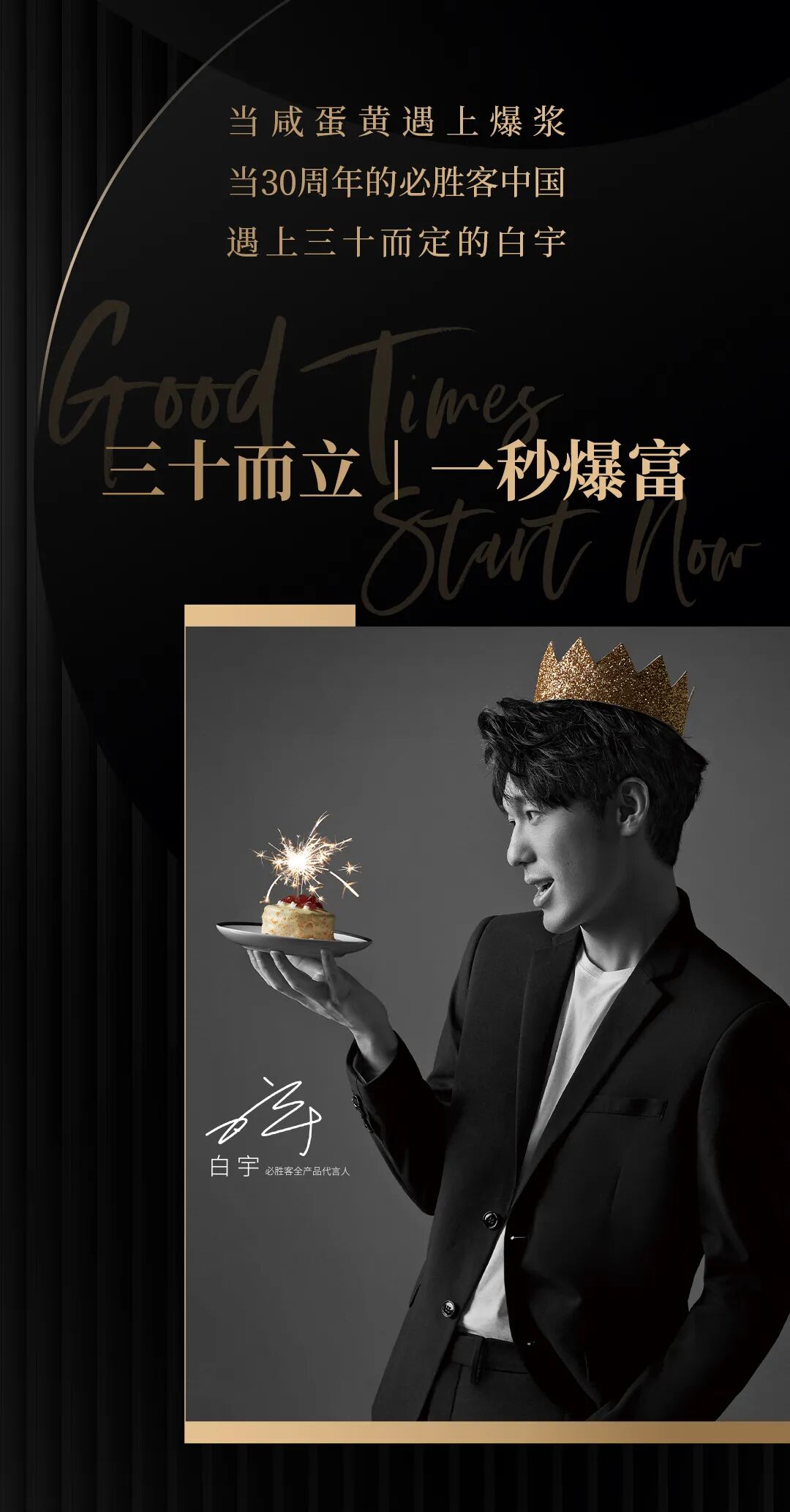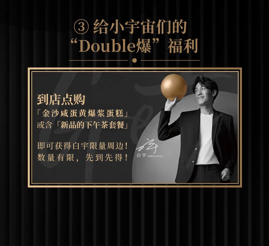 2020年8月24日起,点购爆富一刻(金沙咸蛋黄爆浆蛋糕),即可获得白宇小卡一张(3款随机,全国限量60000张,赠完即止)。点购指定下午茶套餐且所购套餐含爆富一刻(金沙咸蛋黄爆浆蛋糕)或爆富时光拼盘,即可活动白宇海报1张(全国限量32000张,赠完即止)