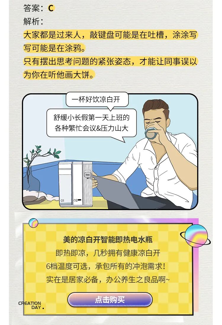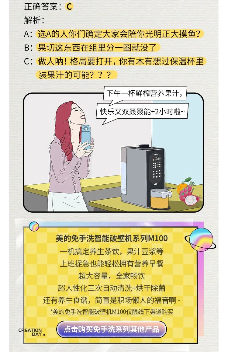 推荐:美的生活电器通过「点击展开」模拟答题,邀请大家一起查看2021年打工人摸鱼测试题的答案,吸引大家预约观看#食色食味双食节#直播。