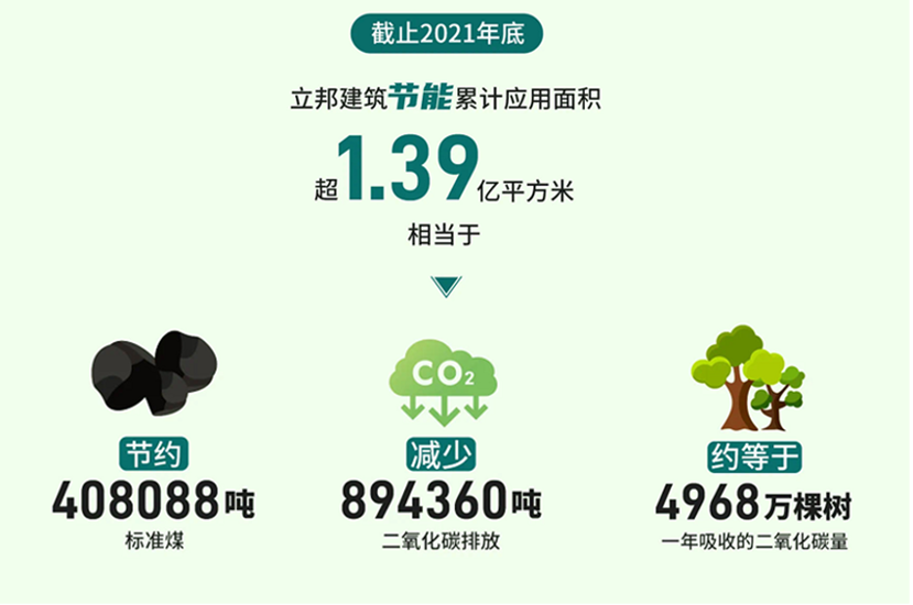 可持续促发展,携手客户和行业伙伴一起成长也是立邦的责任。节能降碳已成为建筑行业发展的主旋律,推动节能低碳的绿色建筑发展,为居住者在绿色建筑中获得幸福感和安全感。经过20多年的布局,立邦中国已逐步建立并建全建筑节能保温隔热领域的全场景解决方案。至2021年底,立邦建筑节能累计应用面积已超过1.39亿平方米,相当于节约了近408088吨标准煤、减少了近894360吨二氧化碳排放,约等于4968万棵树一年吸收的二氧化碳量。立邦正式成立建筑节能事业部,大力发展薄抹灰外墙外保温系统、节能装饰一体板外墙外保温系统、被动式低能耗建筑系统、装配式保温系统等,为建筑行业绿色低碳发展提供持续动能。